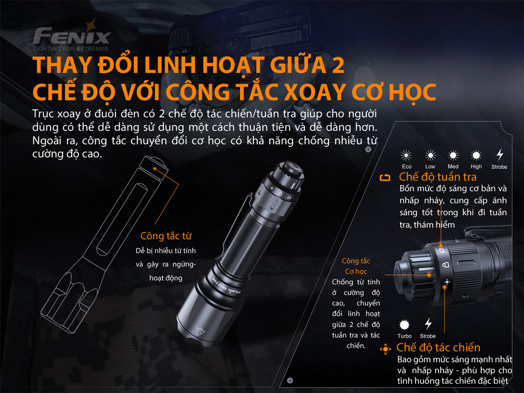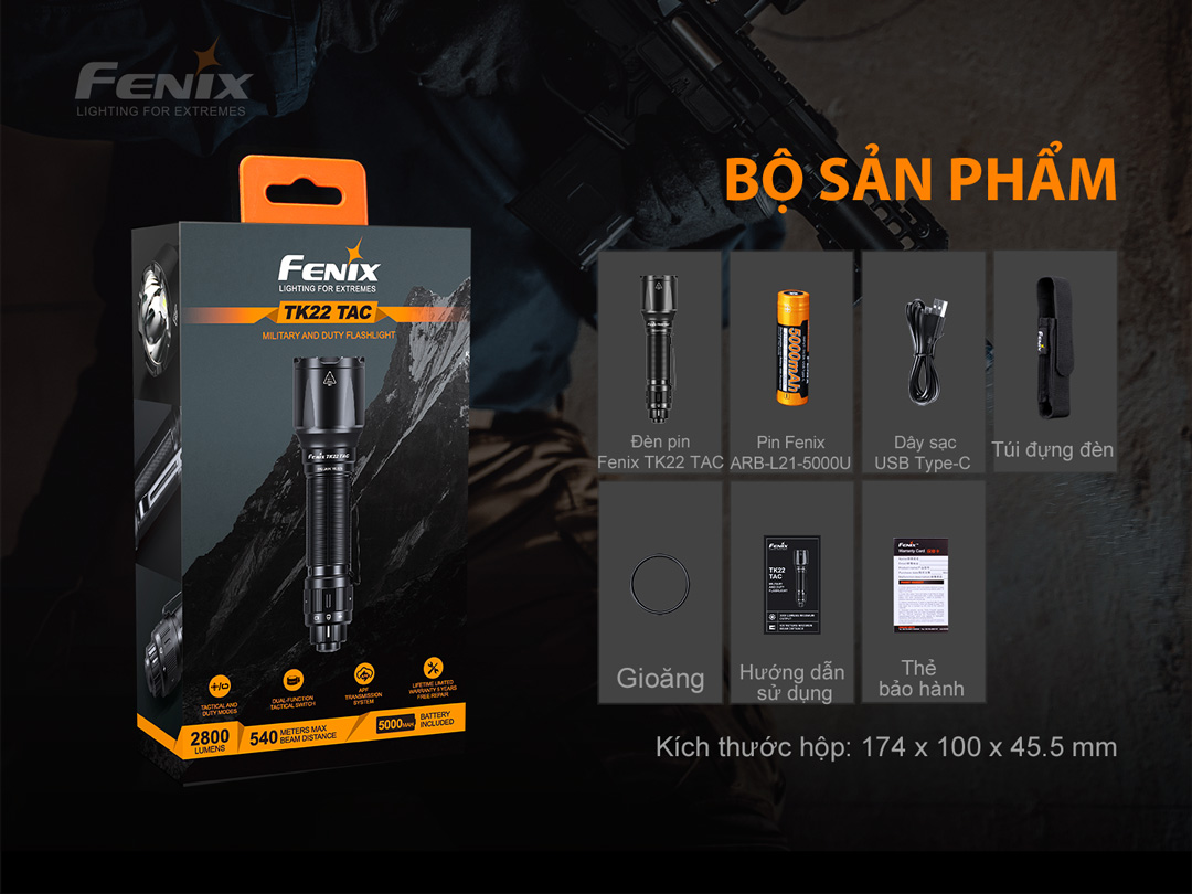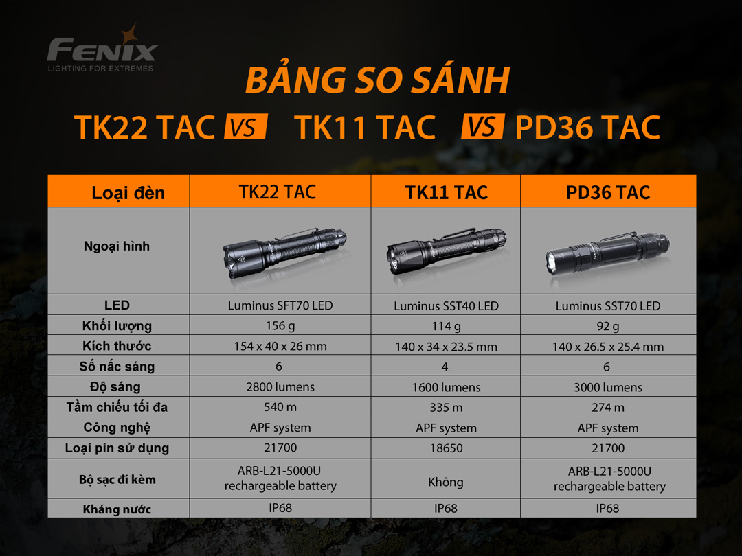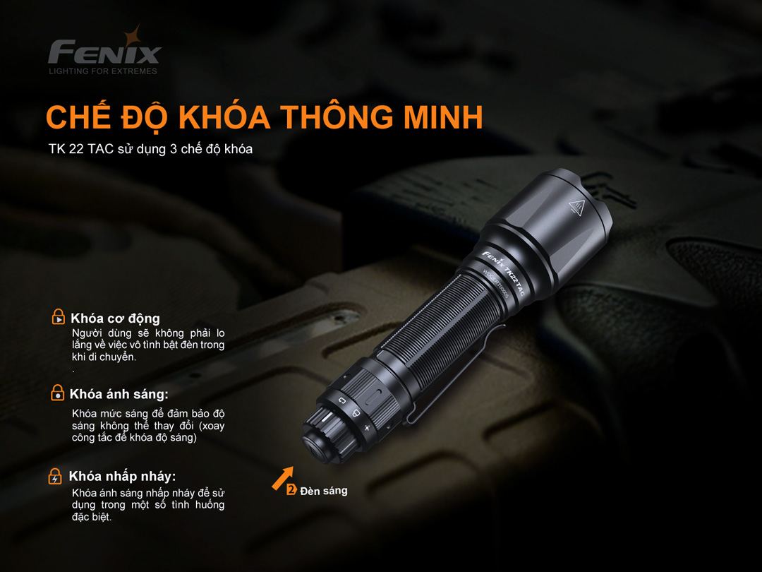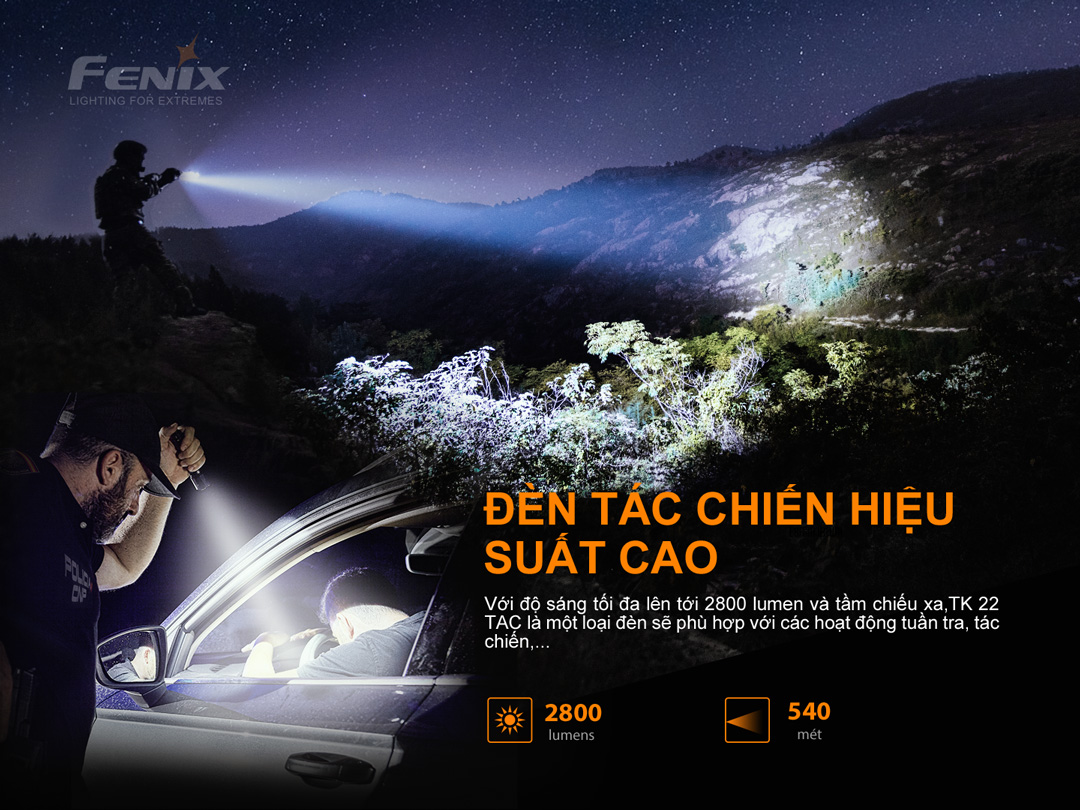 Đèn pin Fenix TK22 TAC là đèn pin tự vệ, t-á-c ch-i-ế-n chuyên nghiệp với độ sáng 2800 lumen và tầm chiếu xa 540m. Phiên bản này được cải tiến đáng kể so với các dòng TK trước, tích hợp công nghệ APF đảm bảo ánh sáng và mạch hoạt động ổn định trong mọi điều kiện. Công tắc xoay cơ học mang lại thao tác linh hoạt trong các tình huống khẩn cấp. Với thiết kế nhỏ gọn và nhiều tính năng thông minh, TK22 TAC là lựa chọn lý tưởng cho các nhiệm vụ đặc thù của công an, cảnh sát và lực lượng chuyên dụng.b