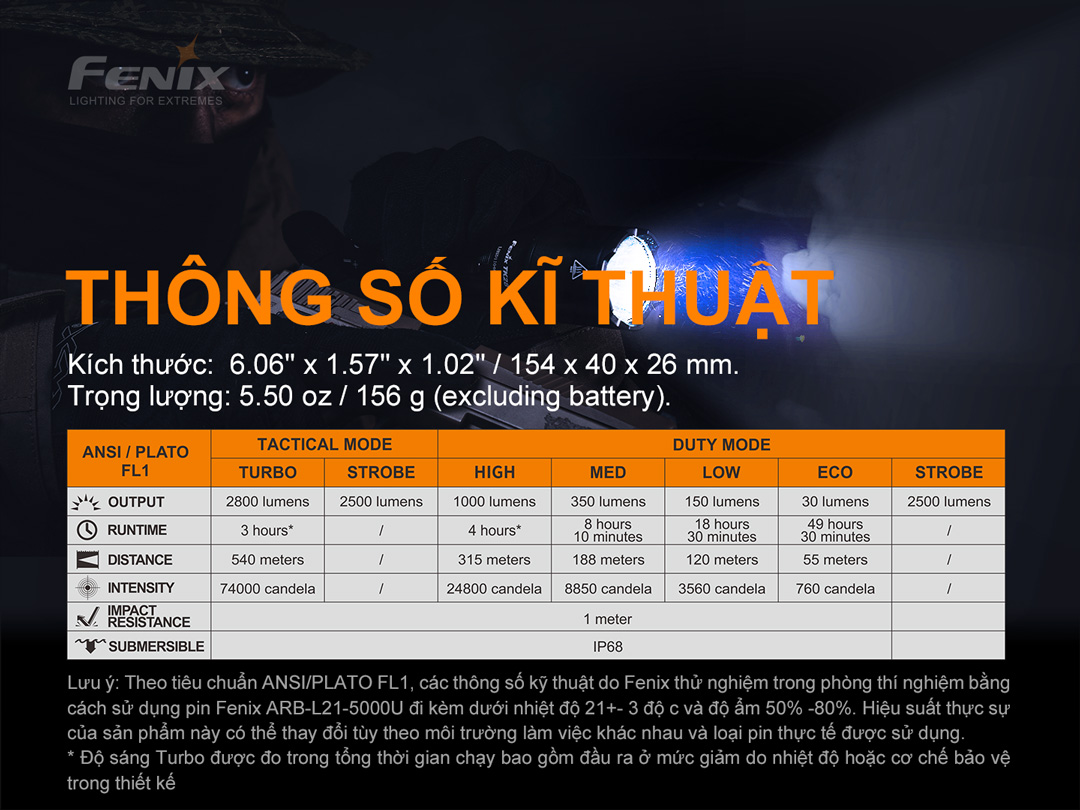 Độ sáng tối đa: 2800 lumen, tầm chiếu xa lên đến 540m, cung cấp ánh sáng mạnh mẽ cho các tình huống tác chiến và ứng dụng chuyên nghiệp.