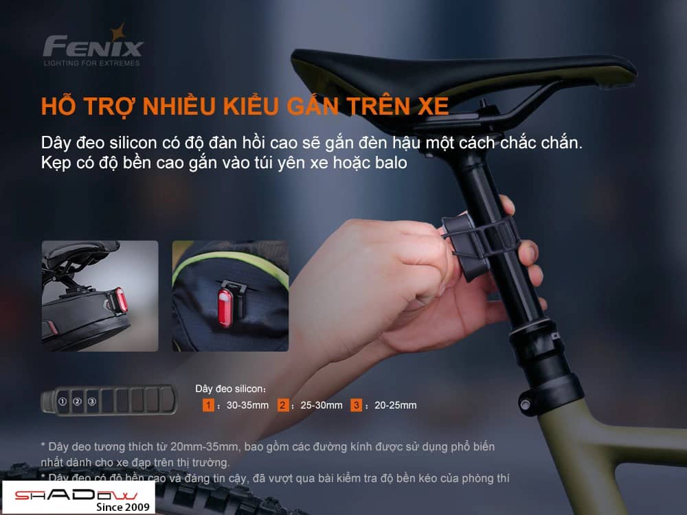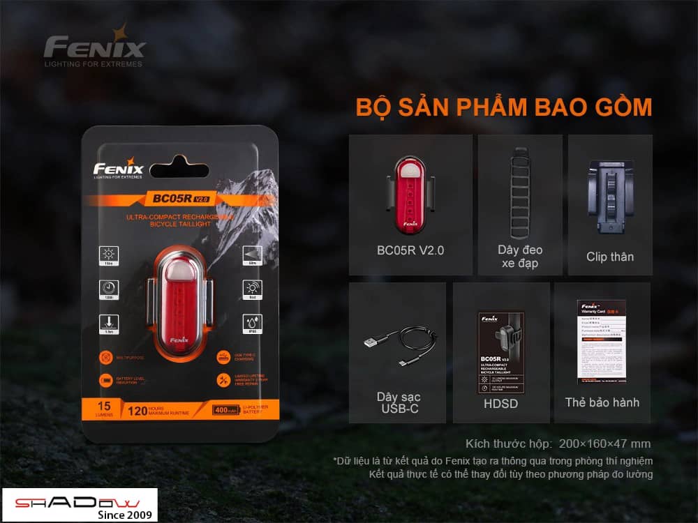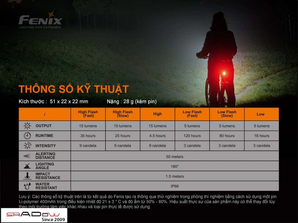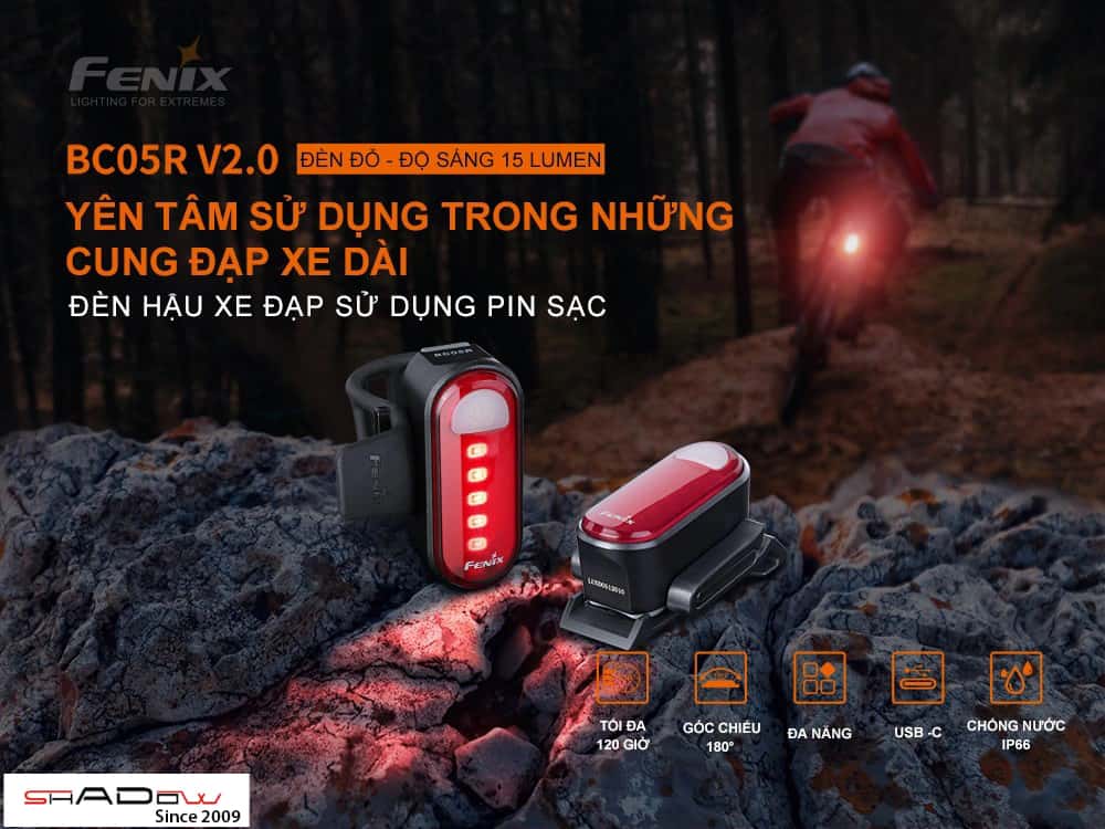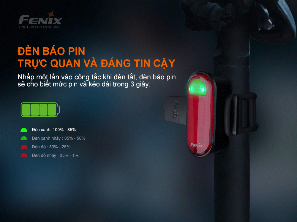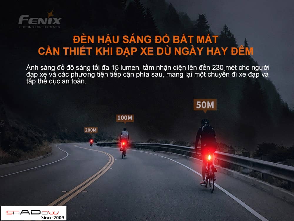 Đèn hậu xe đạp dùng pin Fenix BC05R V2 được thiết kế nhỏ gọn nhẹ với bóng đèn đỏ bắt mắt dành cho tín đồ xe đạp. Đèn xe với độ sáng 15 lumens và tầm chiếu xa tới 230m, đèn sử dụng pin liền thân Li-polymer 400mAh cho thời gian sử dụng lên tới 120 giờ. Đèn hậu xe đạp cao cấp Fenix BC05R V2 với các chế độ chiếu phù hợp với cả đạp xe đô thị và đạp xe đường mòn.