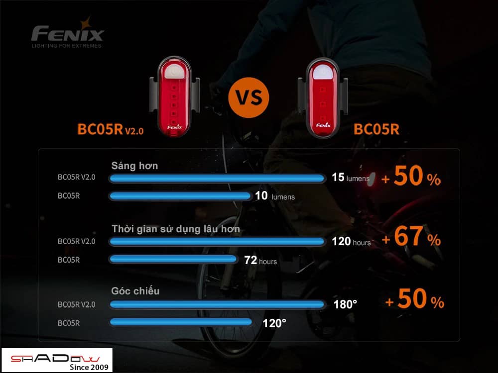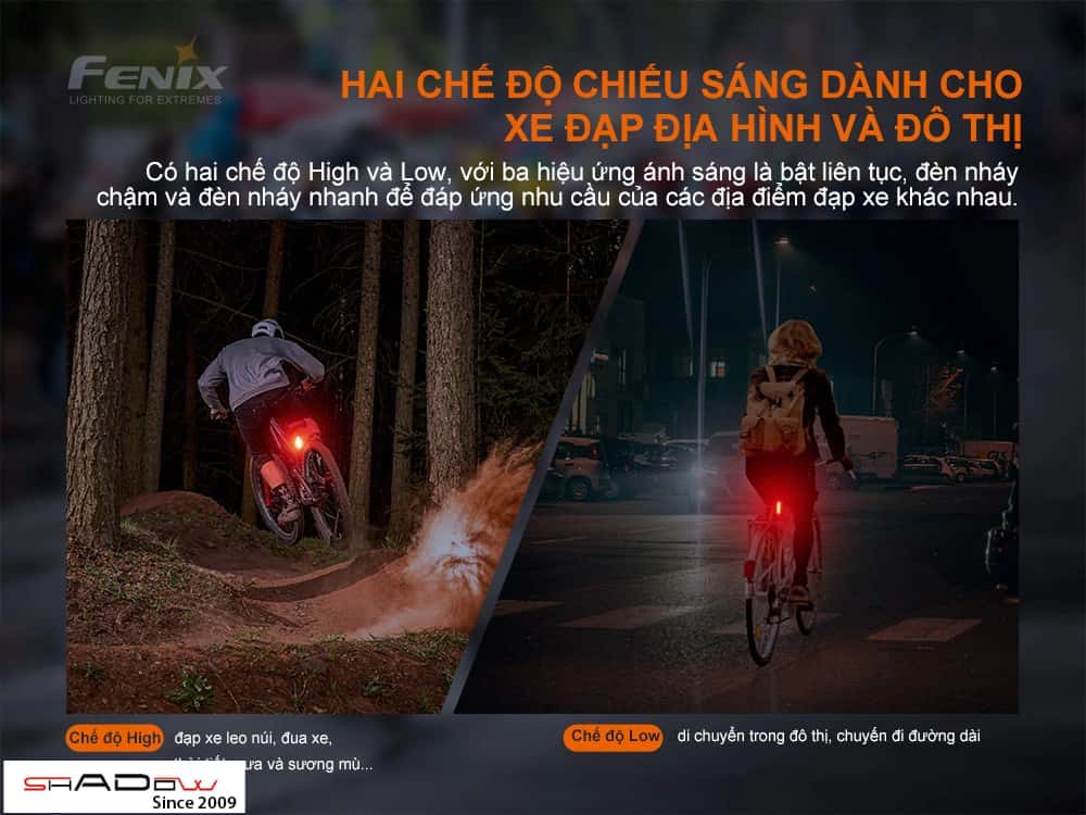 Đèn có hai chế độ chiếu sáng: chế độ sáng mạnh cho đạp xe đường mòn và chế độ sáng thấp cho đạp xe đô thị.