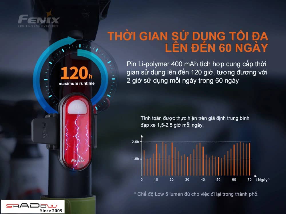 Thời gian sử dụng kéo dài lên đến 120 giờ, phù hợp với những hành trình đạp xe đường trường.