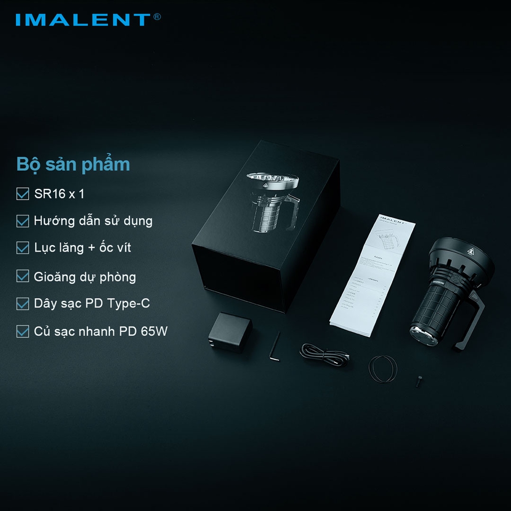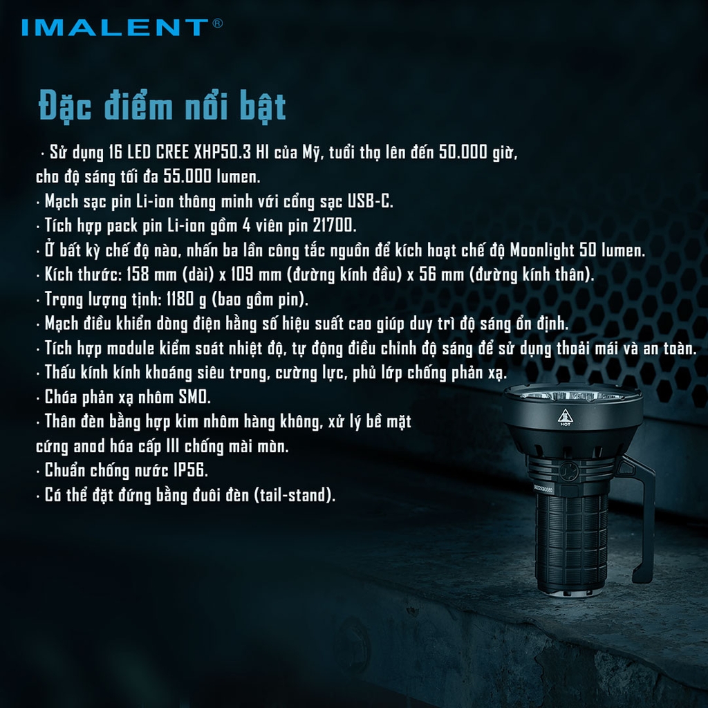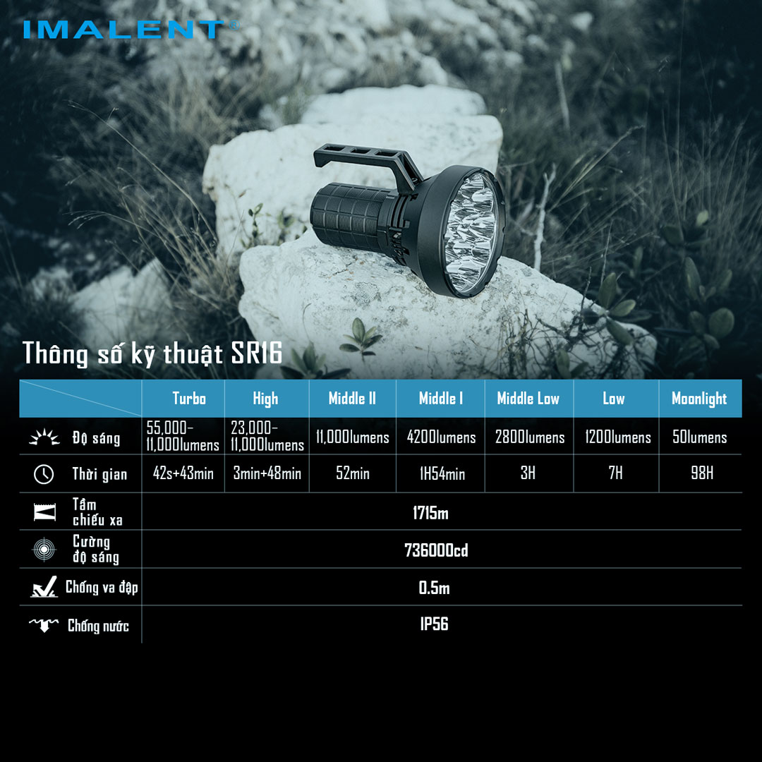 Đèn pin độ sáng khủng IMALENT SR16 là đèn pin siêu sáng được thiết kế đẹp mắt với 16 chiếc đèn LED CREE XHP50.3 Hi, đây là một trong những đèn LED chiếu xa tốt nhất hiện có của IMALENT với tầm chiếu xa lên tới 1.715m. Không những thế với độ sáng 55.000 lumens. Imalent SR16 sẽ là trợ thủ đắc lực không thể thiếu cho các chuyến thám hiểm hang động, tìm kiếm cứu nạn, cũng như đóng vai trò một cây đèn dự phòng cho các tài xế đường dài
