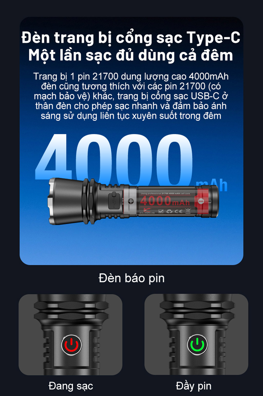 | Pin | 1 pin Klarus 21700 dung lượng 4000mAh |
