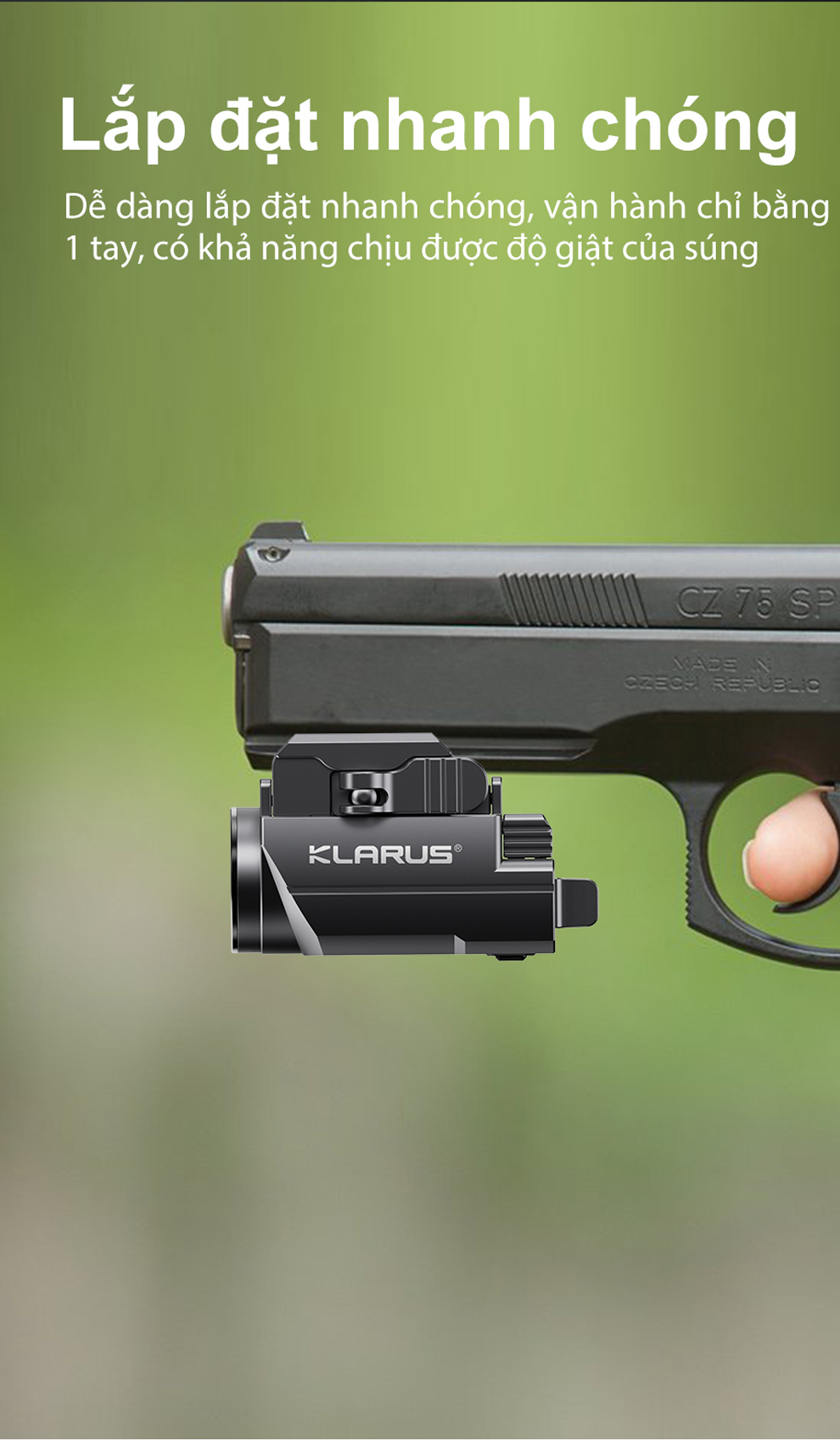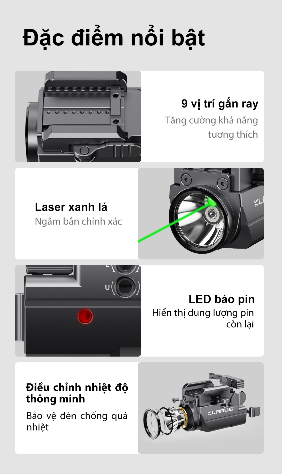 Đèn pin đặc chủng KLARUS GL2 có độ sáng 1000 lumen, tầm chiếu xa 154m cùng kích thước nhỏ gọn được gắn với công cụ chuyên nghiệp trên ray, điểm đặc biệt là đèn có laser xanh giúp hỗ trợ ngắm bắn từ xa. Đèn tương thích với các loại ray Picatinny 1913, M-lok trên các loại sản phẩm chuyên dụng cho các lực lượng thực thi pháp luật,...