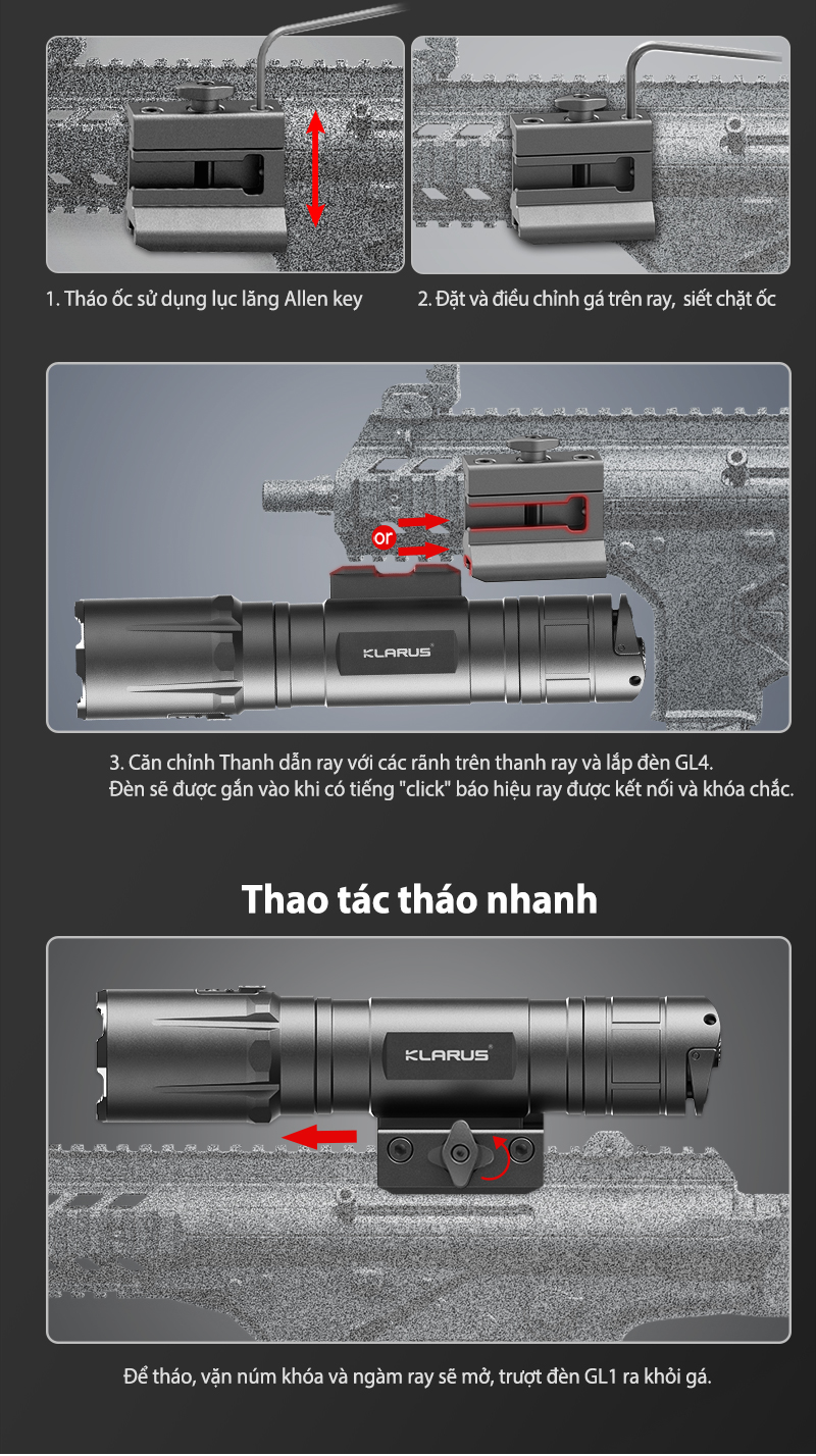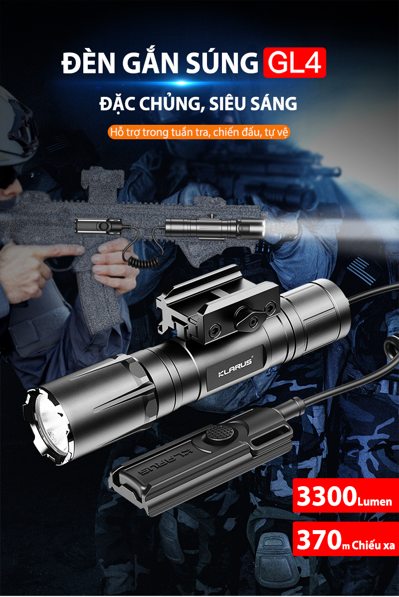 Nhằm đáp ứng nhu cầu công việc của khách hàng, Klarus đã quyết định phát triển sản phẩm đèn pin Klarus GL4 dùng để gắn lên ray (1913, M-lok) trên các loại sản phẩm chuyên dụng cho lực lượng thực thi pháp luật. Đèn pin siêu sáng 3,300 lumen chiếu xa 370 mét được gắn với công cụ chuyên nghiệp bằng đường ray thông minh trên đi kèm, có độ tương thích 90% với các sản phẩm tương ứng.