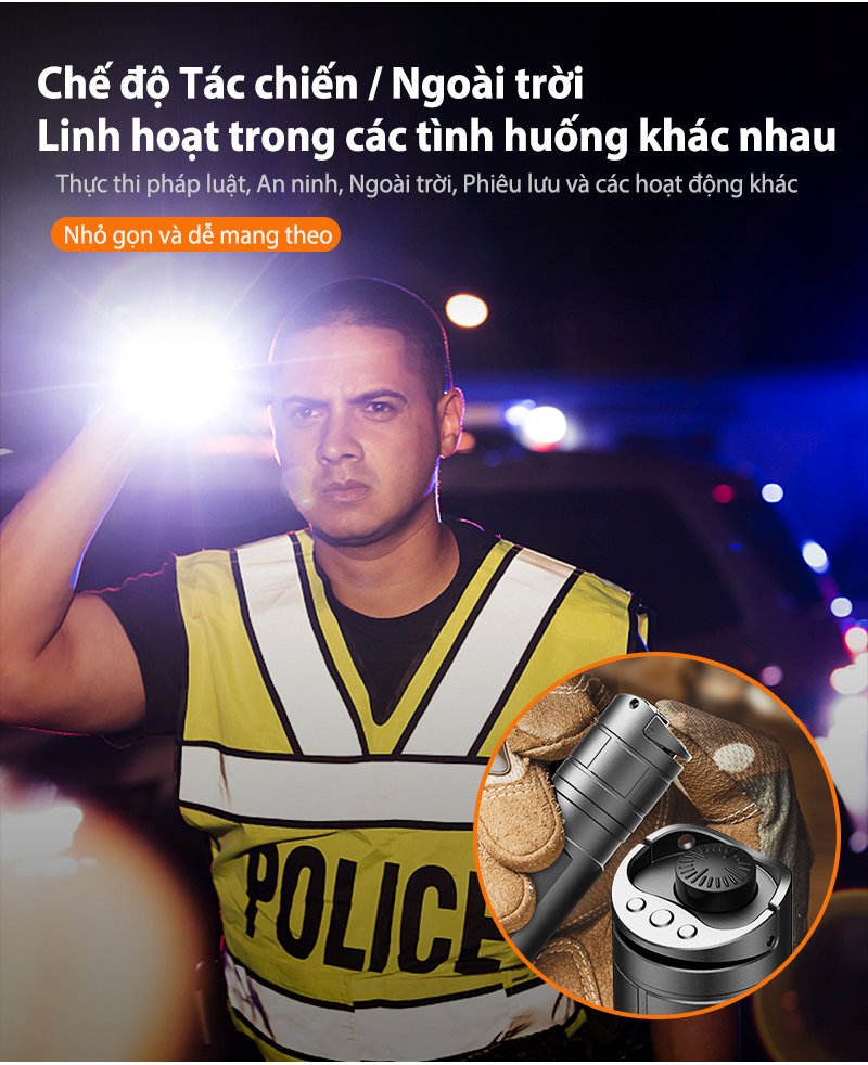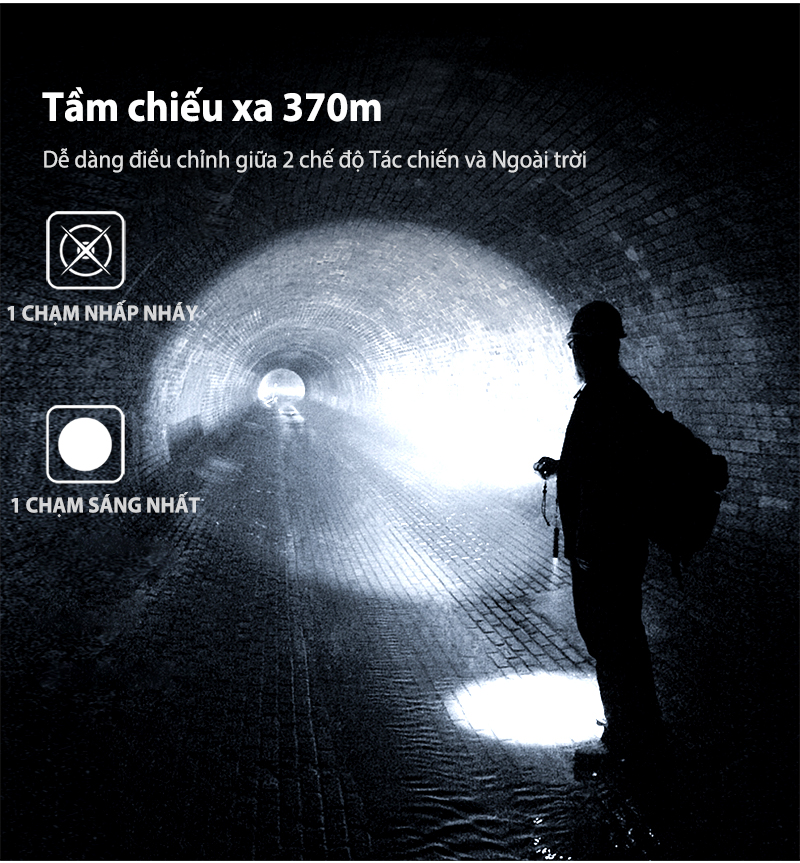 Tại nút chính: bấm 1 lần để bật Turbo – sử dụng nút lẫy để chuyển nấc sáng. Khi đèn đang sáng, bấm giữ nút lẫy khoảng 2 giây, đèn sẽ bật Strobe