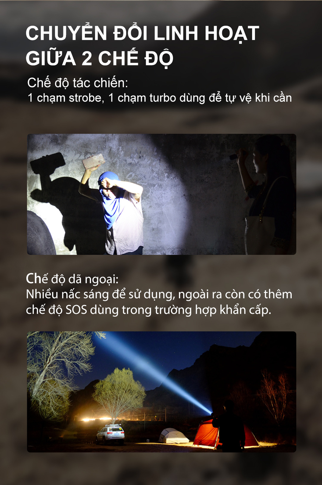 Đèn có thể chuyển đổi linh hoạt giữa 2 chế độ tác chiến và dã ngoại
