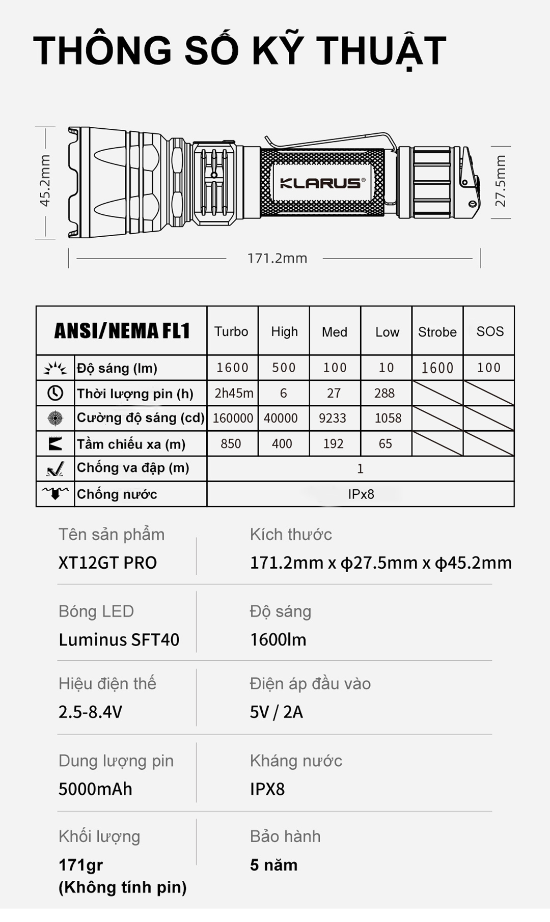 KLARUS XT12GT Pro là phiên bản nâng cấp của XT12GT, trang bị LED Luminus SFT40 với độ sáng 1600 lumen và tầm chiếu xa 850m. Đèn sử dụng pin sạc KLARUS 21700 dung lượng 5000mAh, kết hợp công nghệ mạch tiên tiến, cho thời lượng pin ấn tượng và khả năng duy trì chế độ Turbo lên tới 2 giờ 45 phút. Với giao diện thân thiện, thao tác đơn giản nhờ công tắc kép thế hệ 5, XT12GT Pro là lựa chọn lý tưởng cho lực lượng thực thi pháp luật,cả-nh s-át, quâ-n đ-ội, bảo vệ và các hoạt động s-ăn b-ắ-n ban đêm.