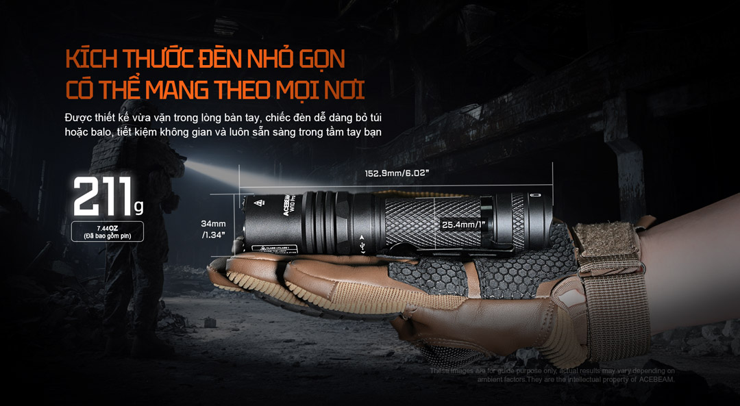 | Kích thước | 152,9mm (dài) x 34mm (đầu đèn) x 25,4mm (thân). |