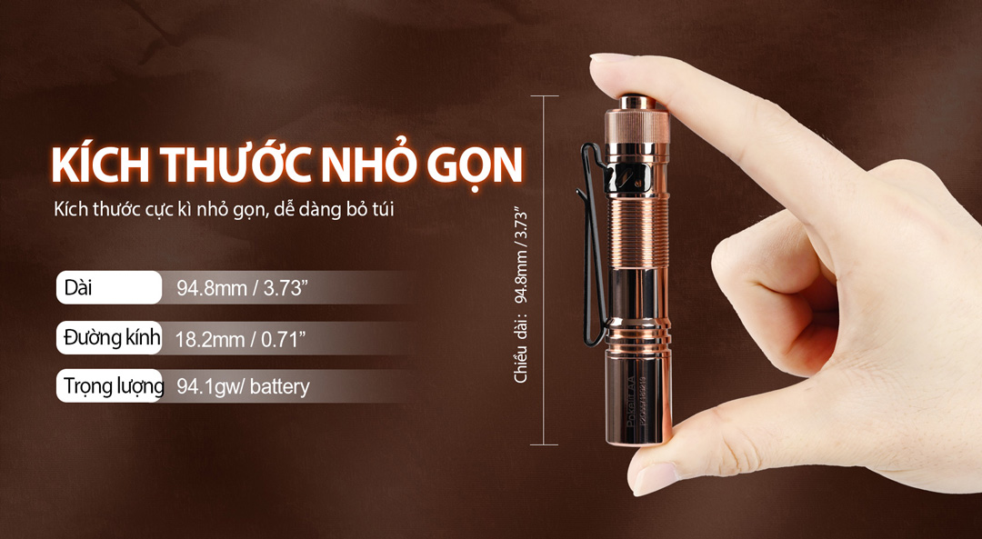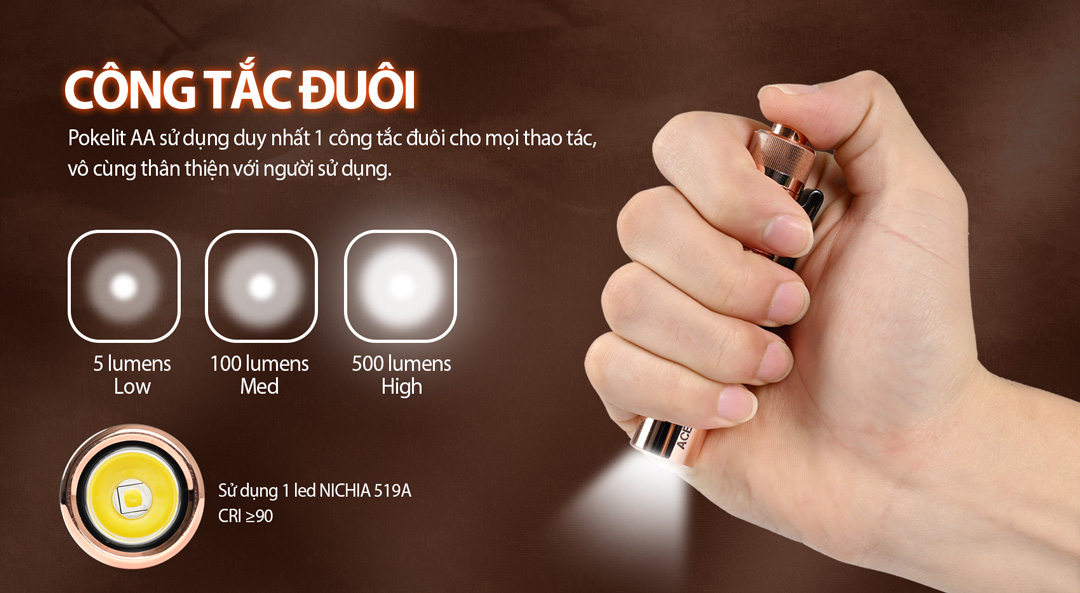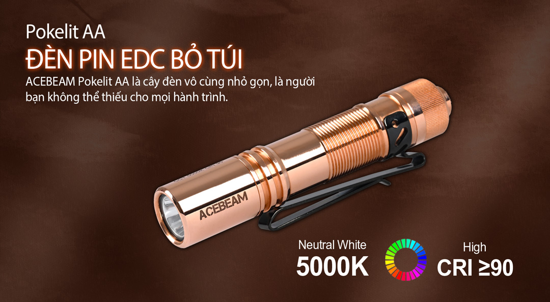 Đèn pin mini ACEBEAM POKELIT AA Copper là phiên bản đồng của mẫu đèn pin mini EDC nổi tiếng cao cấp của Acebeam với độ sáng đạt 500 lumen va tầm chiếu xa 80m. Ở phiên bản này, đèn đã được thiết kế hoàn toàn bằng đồng thau, vô cùng đẹp và tinh xảo. Với LED Nichia, ánh sáng có độ hoàn màu cao giúp làm dịu mắt người và phản ánh màu sắc của vật thể một cách chân thực nhất. Đèn dễ dàng bỏ túi sản phẩm EDC, mang theo và sử dụng hàng ngày, hoạt động ngoài trời như cắm trại, tìm kiếm, hoặc sưu tầm,...
