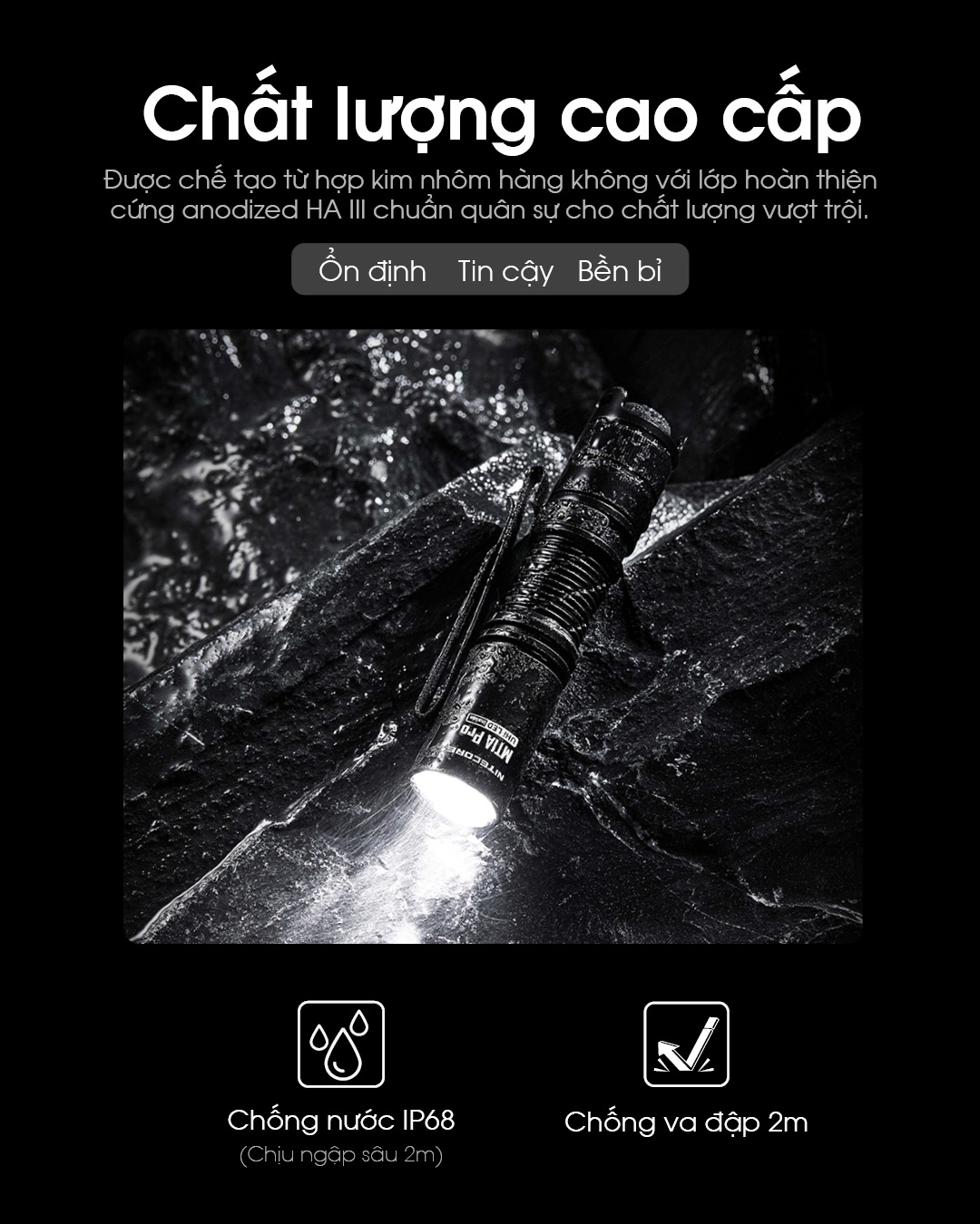 NITECORE MT1A Pro là một đèn pin nhỏ gọn, sử dụng pin 14500 NL1411R hoặc 1 pin AA, mang đến sự linh hoạt cao cho người dùng. Đèn có công suất tối đa 800 lumens, tầm chiếu xa lên tới 250m. Với thiết kế nhỏ gọn chỉ 52g (đã bao gồm pin) ,bền bỉ, đèn chống nước IP68 và chịu va đập ở độ cao 2 mét. Ngoài ra, đèn còn tích hợp nhiều chế độ sáng, từ ánh sáng mạnh đến chế độ SOS khẩn cấp, phù hợp cho các hoạt động ngoài trời, sửa chữa hoặc sử dụng hàng ngày.