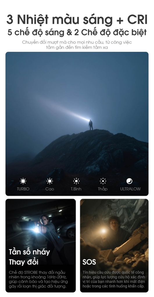 3 nhiệt màu – 5 mức sáng – STROBE & SOS