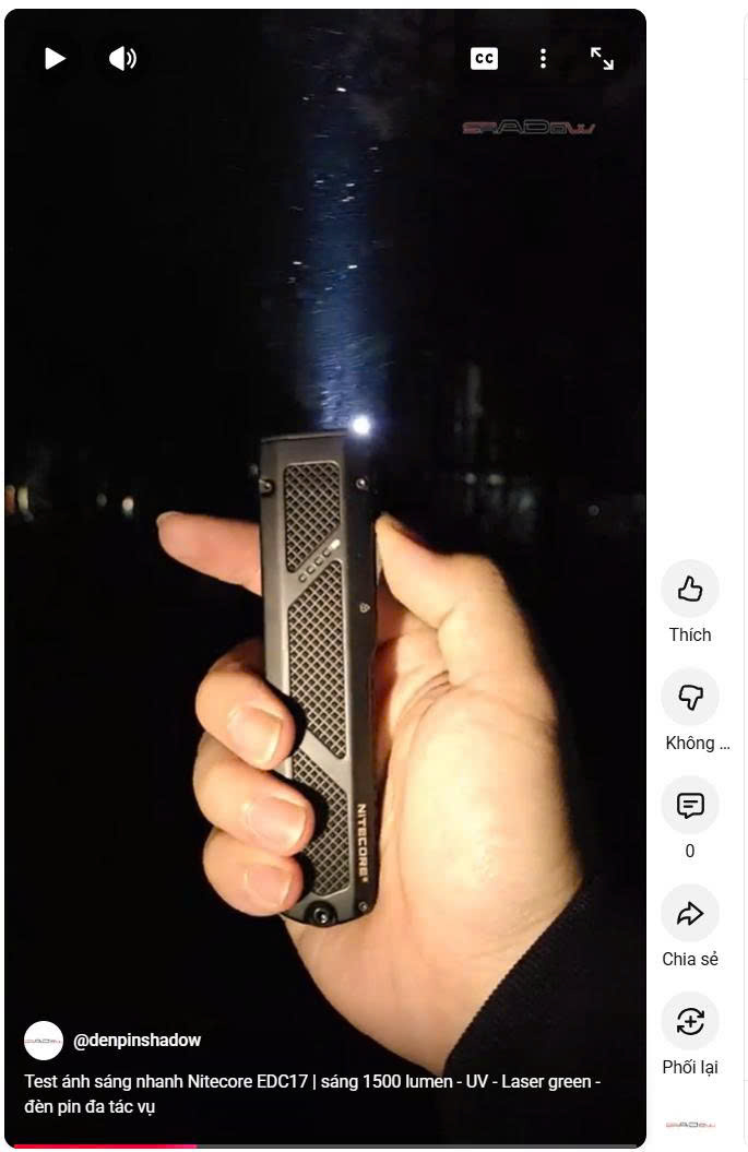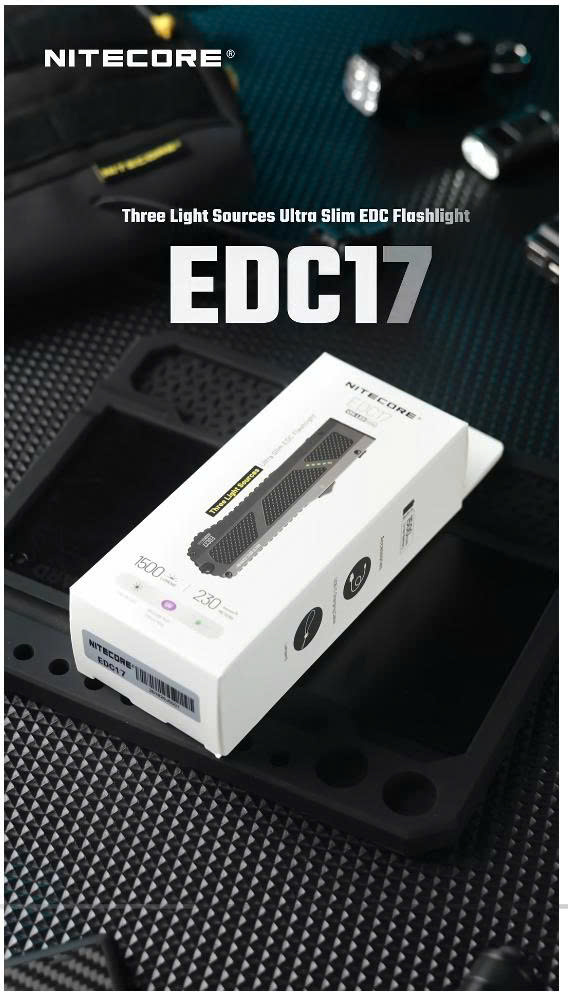 NITECORE EDC17, thiết kế thân mỏng dẹt, có 3 nguồn sáng: ánh sáng trắng 1.500 lm, UV 365–375 nm (220–1350 mW) phục vụ kiểm tra/nhận diện, và laser xanh lá <5 mW (Class 3R) để chỉ điểm. Tất cả điều khiển nhanh bằng công tắc trượt + nút bấm, có đèn báo dung lượng 4 vạch, USB-C, IPX7, chống va đập 2m, phù hợp với nhiệt hoạt động sử dụng khác nhau.