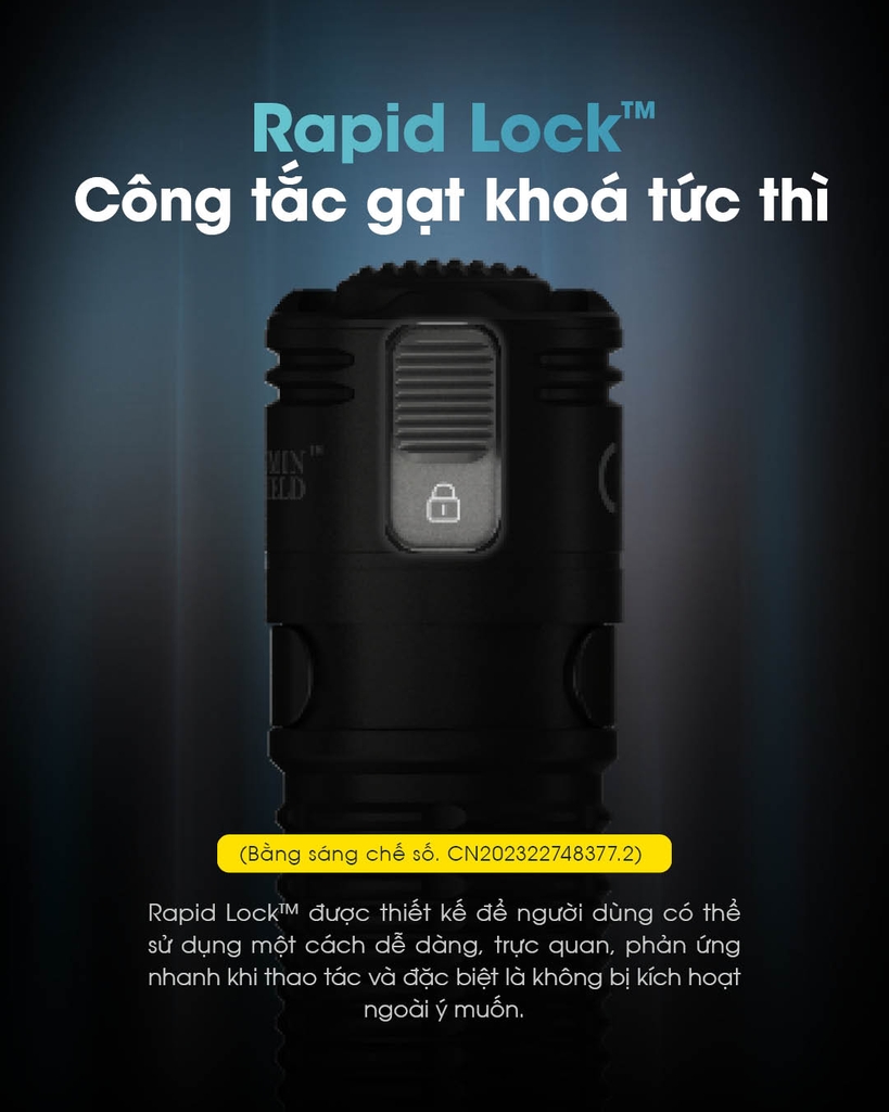 Khi đèn bật / tắt, trượt Công Tắc Khóa (Rapid Lock™) lên để truy cập Chế Độ Khóa Hoàn Toàn. Biểu tượng khóa có thể thấy dưới Công Tắc Khóa (Rapid Lock™), chỉ ra rằng nút đuôi không khả dụng để kích hoạt đèn pin.