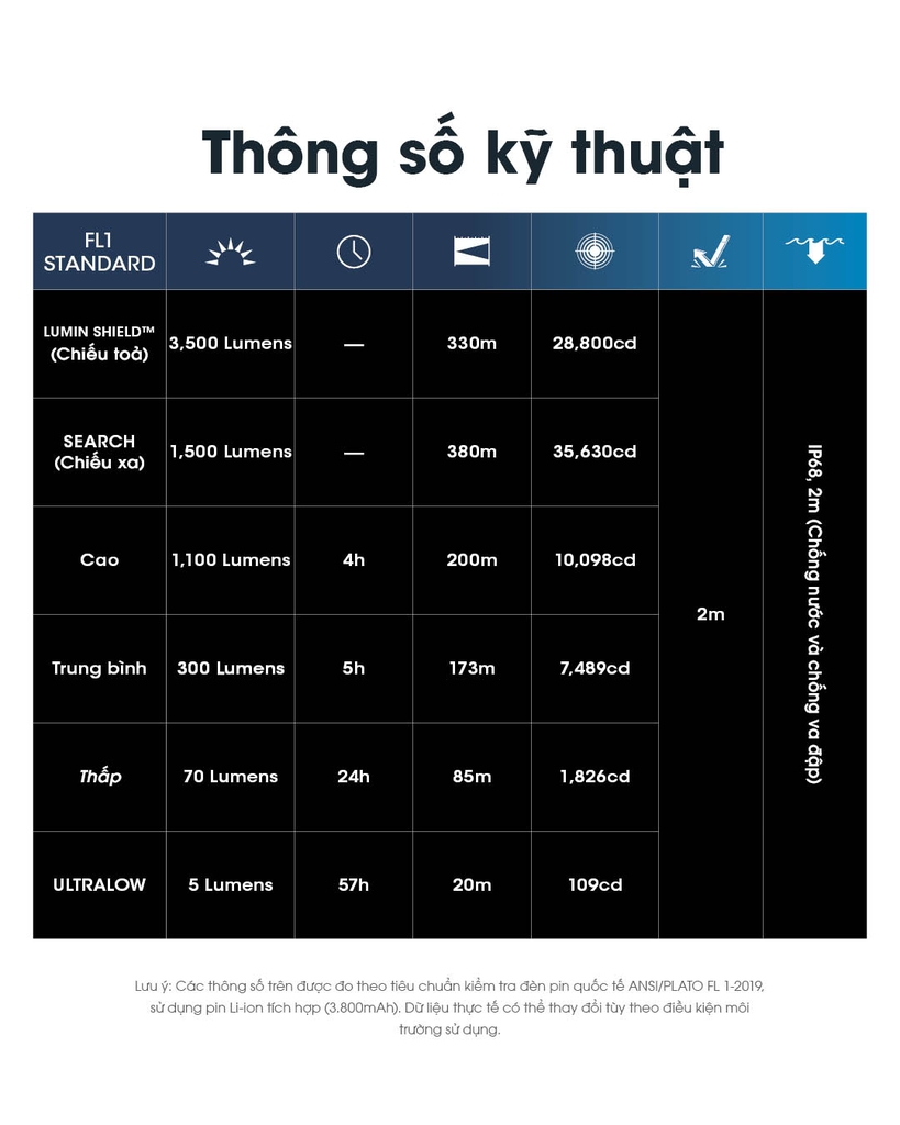 Chức năng chiếu sáng có sẵn trong quá trình sạc (trừ LUMIN SHIELD™ và SEARCH). Thời gian sạc khoảng 3 giờ 30 phút (sạc qua bộ sạc 5V/2A). Khi pin đầy, thời gian chờ khoảng 12 tháng.