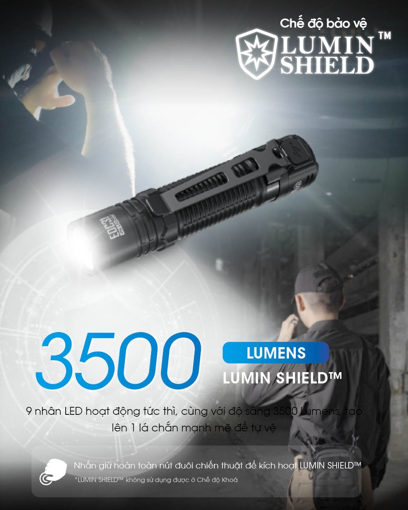 Khi đèn bật / tắt, nhấn hoàn toàn và giữ nút đuôi để truy cập trực tiếp vào LUMIN SHIELD™ (5,000 lumens). Thả ra để trở về trạng thái trước đó.