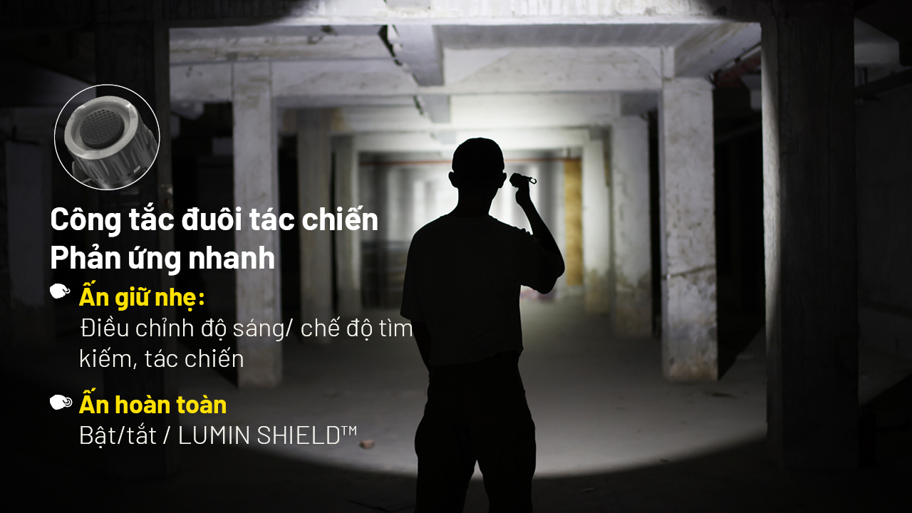Khi đèn bật / tắt, nhấn hoàn toàn và giữ Nút Đuôi để truy cập trực tiếp vào LUMIN SHIELD™ (4,000 lumens). Thả ra để trở về trạng thái trước đó.