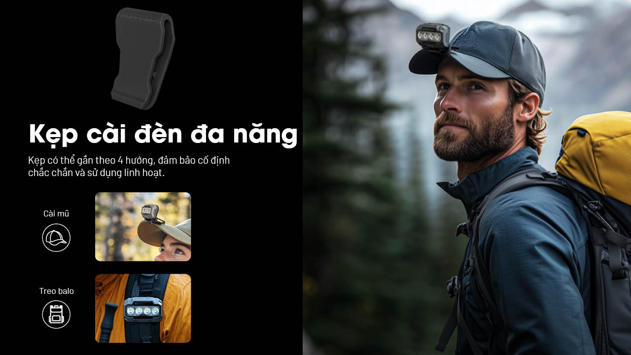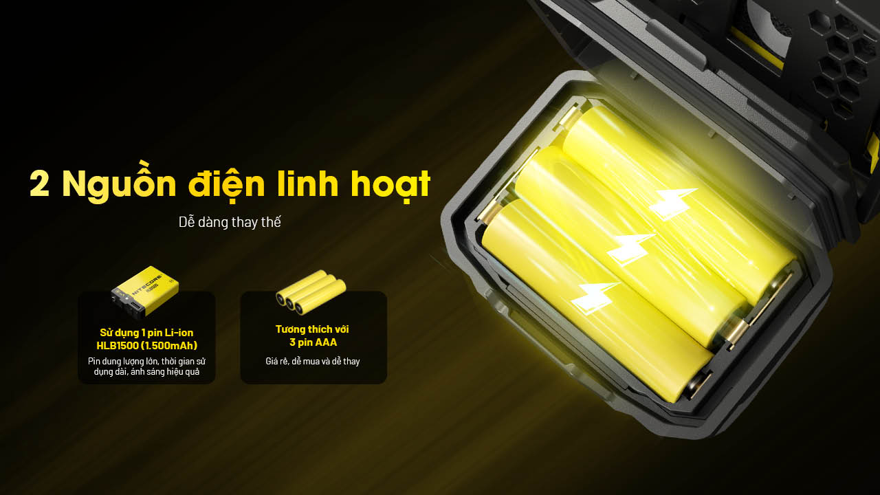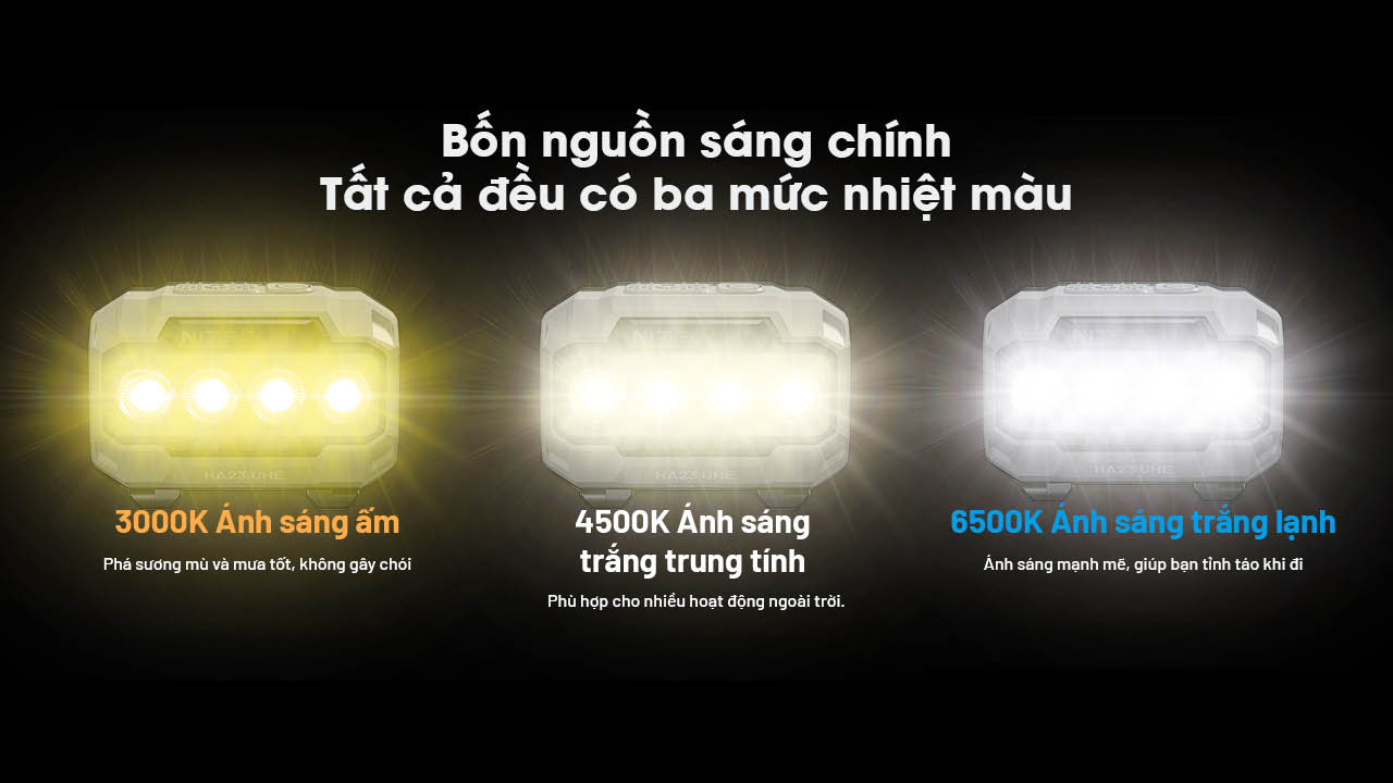 NITECORE HA23 UHE – Đèn pin đội đầu 600 lumens, tầm chiếu xa 132m. Sử dụng LED đa nhiệt màu (3000K/4500K/6500K) cùng đèn phụ ánh sáng đỏ. Hỗ trợ pin AAA (kèm theo) và pin Li-ion HLB1500 (Phụ kiện mua ngoài), thời gian sử dụng tối đa 125 giờ. Thiết kế siêu nhẹ 56g (chưa bao gồm pin và dây đeo), chống nước IP68, chịu va đập 1m – lý tưởng cho chạy bộ, dã ngoại, leo núi, sửa chữa.
