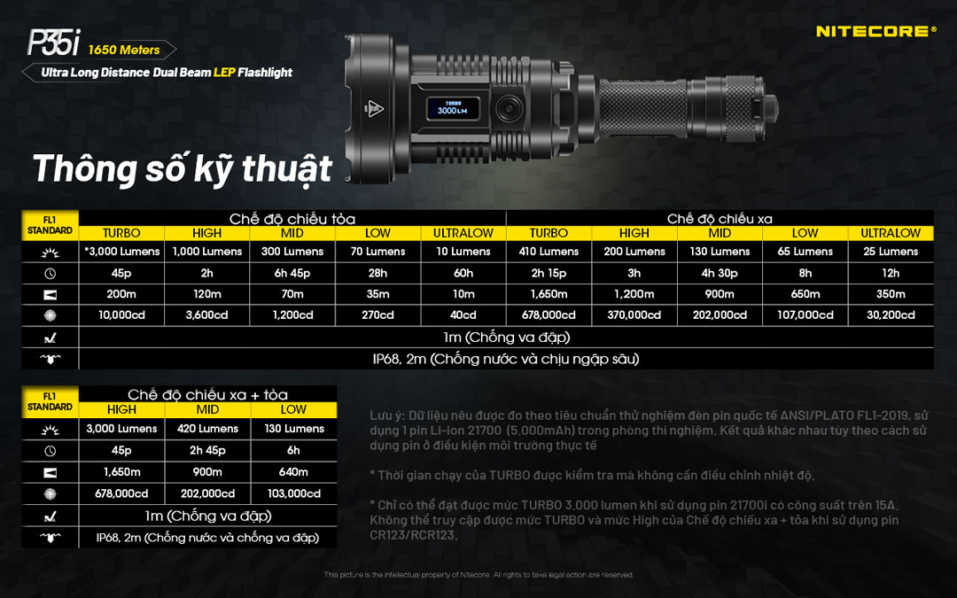 NITECORE P35i là mẫu đèn pin độc đáo CAO CẤP tích hợp bóng LED và 1 module laser trắng LEP, có khả năng đáp ứng được cả 2 nhu cầu chiếu toả và chiếu siêu xa, có độ sáng lên tới 3.000 lumens và tầm chiếu xa 1650m. Đèn được làm từ hợp kim nhôm hàng không, đạt tiêu chuẩn chống bụi, nước IP68. Với tất cả những tính năng trên, NITECORE P35i sẽ trở thành công cụ chuyên dụng dùng trong các công việc tìm kiếm, cứu hộ,...