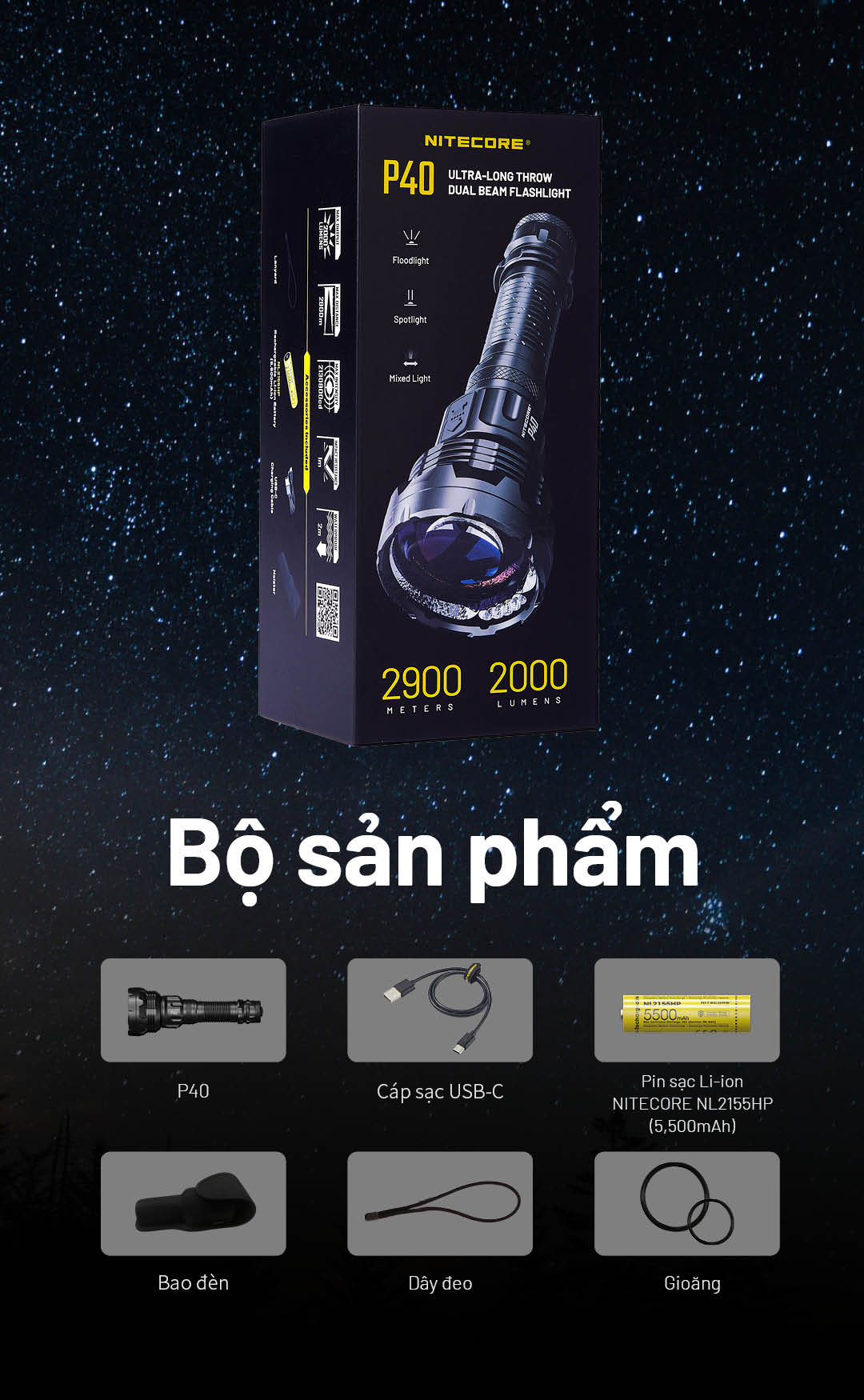 NITECORE P40 là đèn pin Dual-Beam LEP và LED cho tia chiếu siêu xa kết hợp đèn tỏa linh hoạt. Độ sáng tối đa 2.000 lm, tầm chiếu siêu xa 2.900m, thời gian sử dụng tối đa lên tới 20 giờ. Nhờ vào pin 21700 dung lượng cao 5.500mAh, sạc nhanh USB-C 18W, điều khiển 3 công tắc trực quan, nhớ mức sáng, IP68 – lý tưởng cho săn bắn, tìm kiếm cứu nạn, tuần tra, lực lượng chức năng.