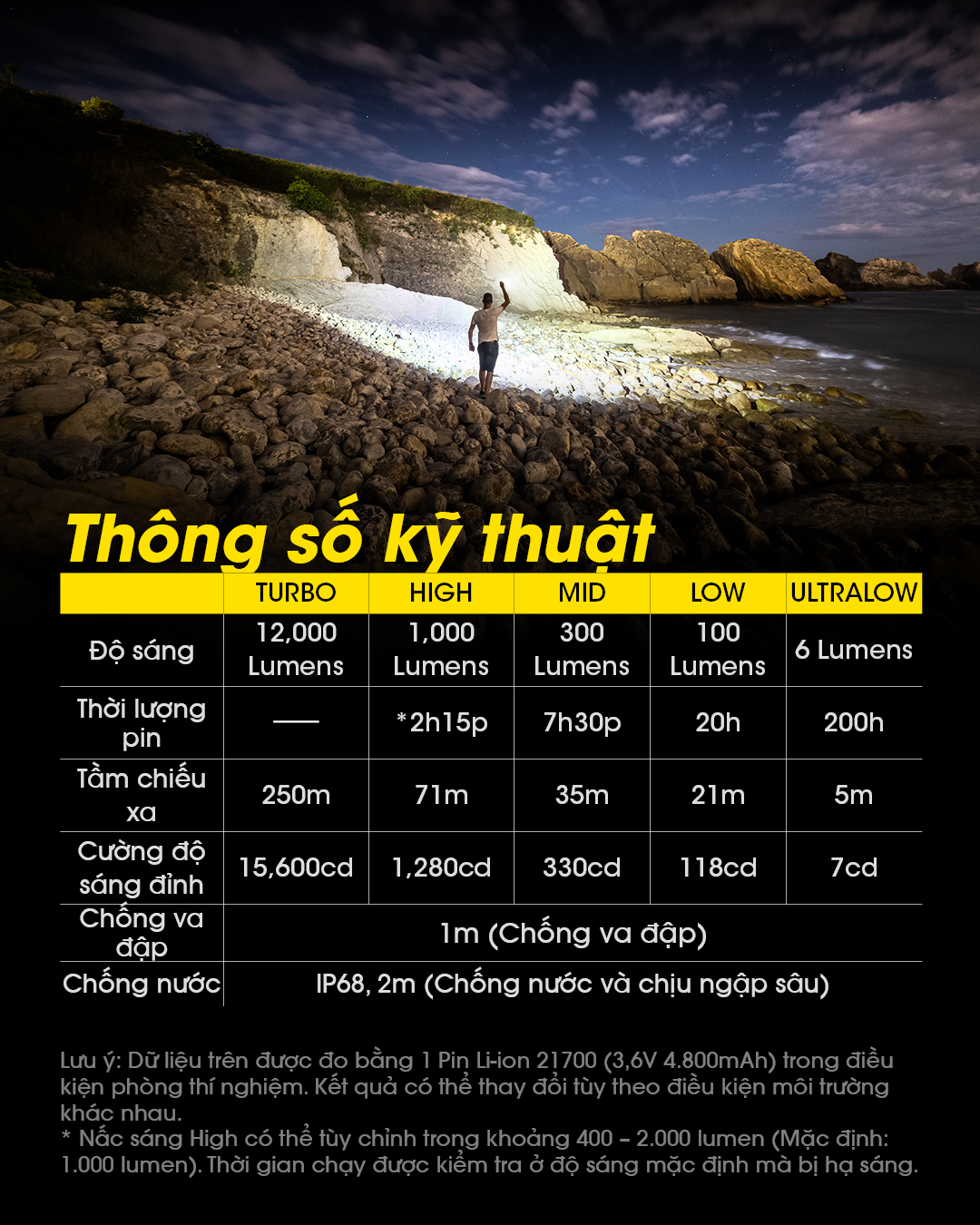 NITECORE TM12K sử dụng 1 pin Li-ion 21700 dung lượng 4.800 mAh liền thân và được sạc qua cổng sạc USB Type-C. Với tất cả những tính năng trên, NITECORE TM12K sẽ trở thành công cụ đồng hành hiệu quả khi sử dụng trong các hoạt động chuyên dụng như tuầ-n tr-a, tá-c ch-iến, cũng như dã ngoại, dân dụng..