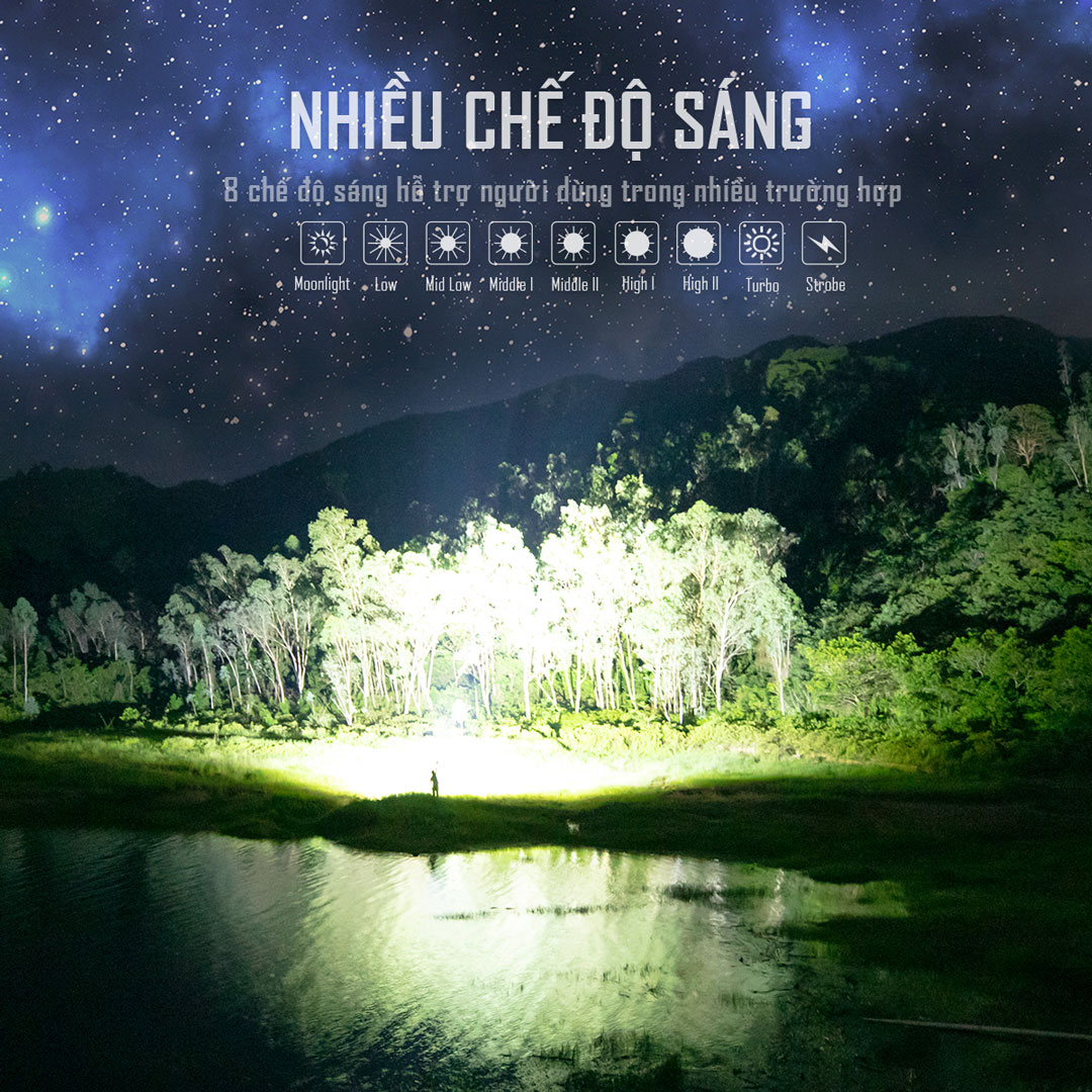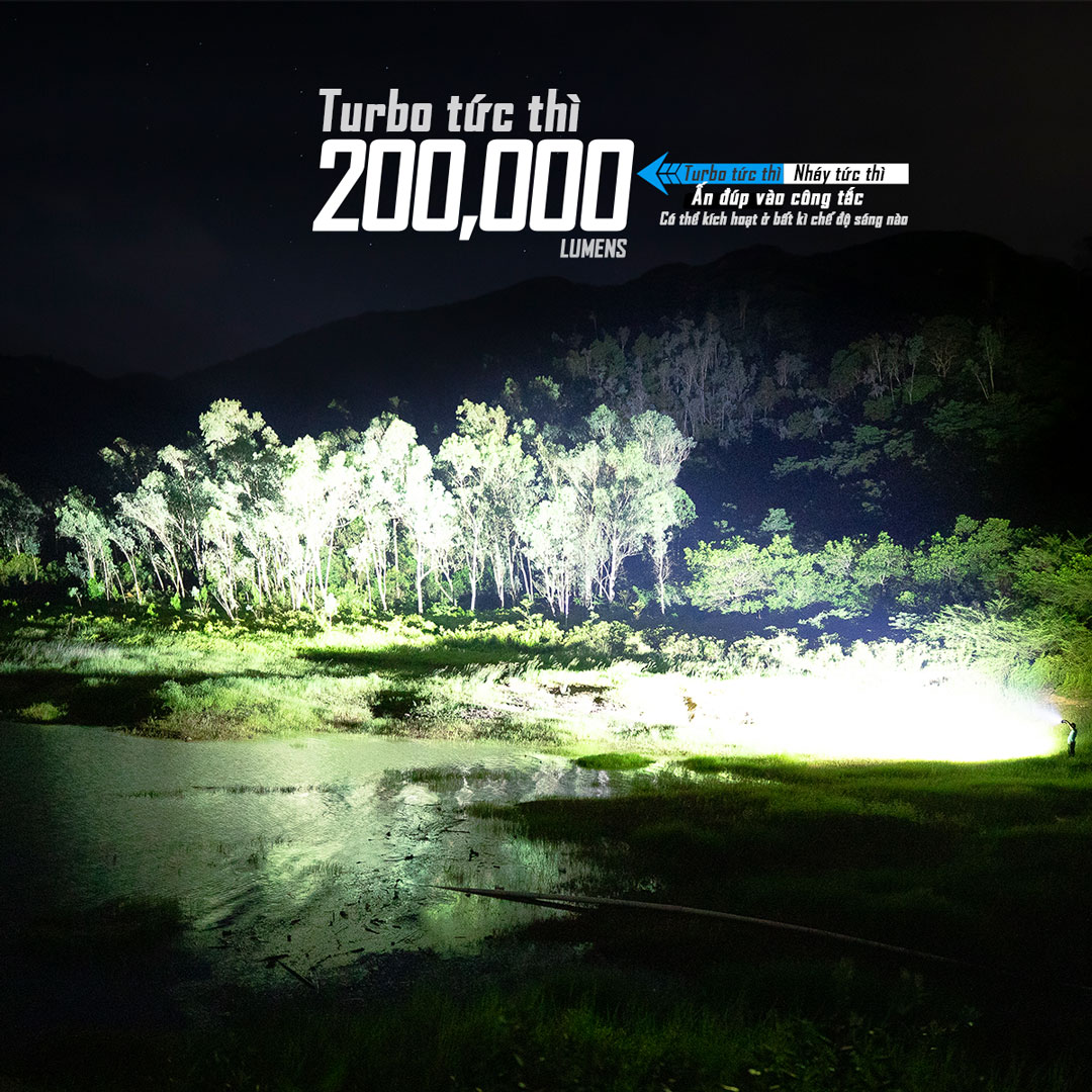 - Turbo: 200.000 - 40.000 lumens, 45s - 40 phút, 1618m, 655.000Cd