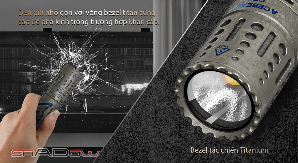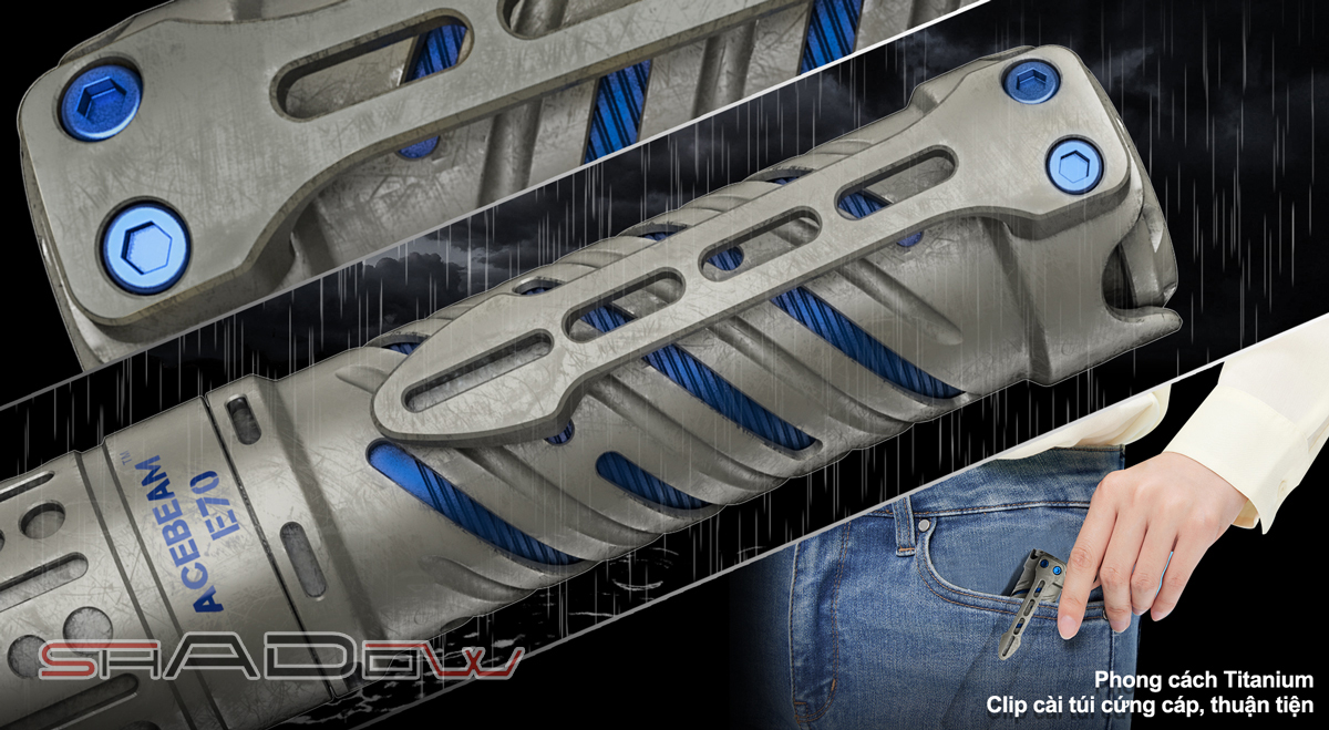 Đèn pin siêu sáng Acebeam E70 Titanium là phiên bản Titanium của đèn Acebeam E70, có thiết kế rất mới, hoàn toàn bằng Titanium với vẻ thiết kế độc đáo. Gia công chính xác CNC từ Titanium, cực bền và nhẹ. Cây đèn nhỏ bé chỉ 5.05" này có độ sáng lên tới 4000 lumen. Đèn sử dụng một bóng LED CREE XHP70.2 và 1 pin Li-ion 21700. Nấc sáng HIGH 1000 lumen quá đủ để bạn chiếu sáng cả chặng đường dài hoặc bãi cắm trại. Bạn sẽ rất hài lòng với nấc sáng moon light chiếu liên tục trong 264 giờ. Đèn có 6 nấc sáng và 1 chế độ Strobe (nhấp nháy) hỗ trợ người dùng trong mọi tình huống. Chế độ khóa và thao tác "bấm đúp để bật" giúp bảo người dùng tránh khỏi các tình huống kích hoạt ngẫu nhiên. Đèn pin siêu sáng Acebeam E70 Titanium là cây đèn EDC hoàn hảo, sử dụng đa mục đích và phù hợp với nhiều đối tượng sử dụng.