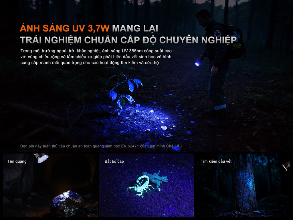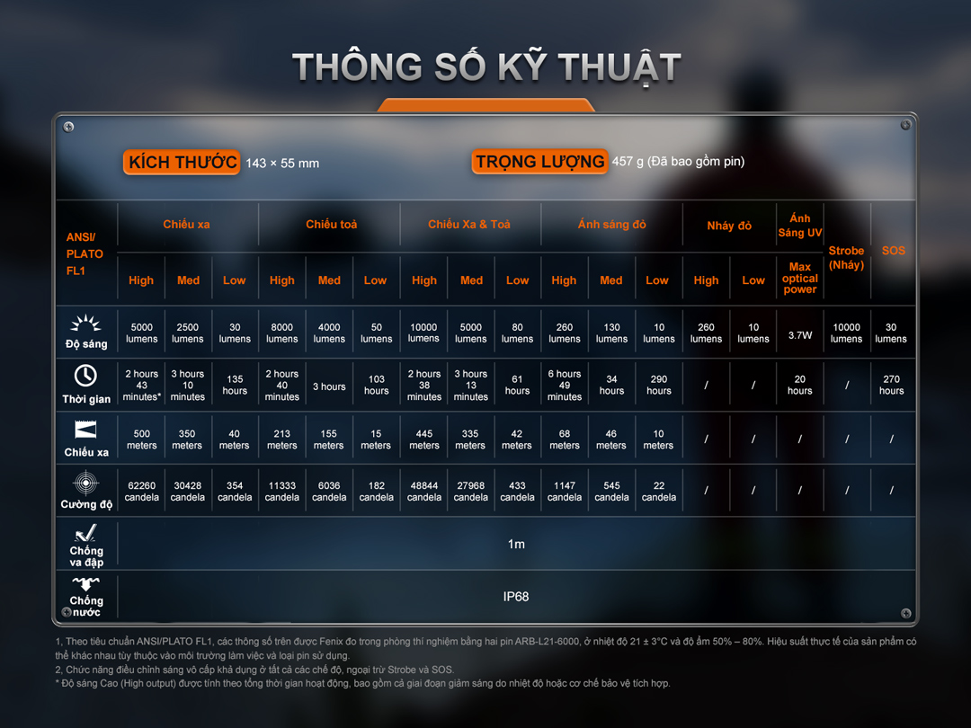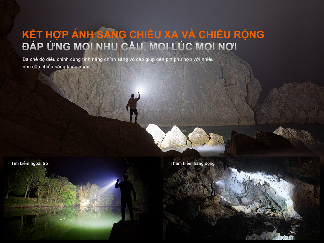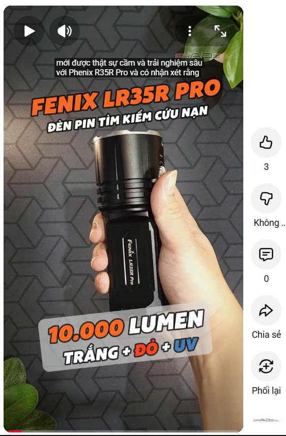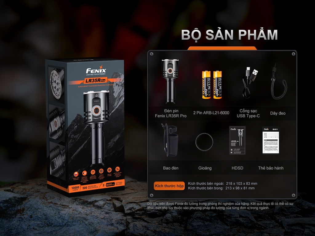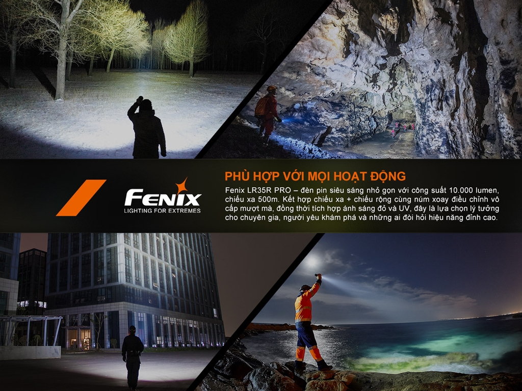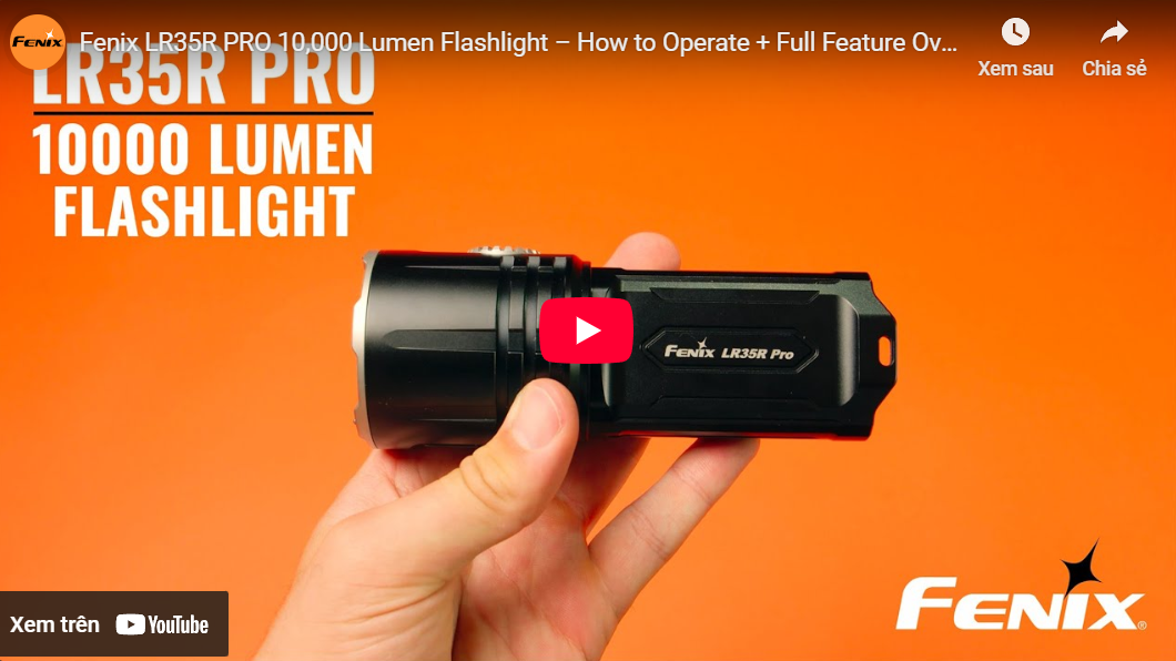 Fenix LR35R PRO – Đèn pin siêu sáng 10.000 lumen, chiếu xa 500m, thân đèn nhỏ gọn, điều khiển vô cấp bằng công tắc xoay kết hợp nút bấm. Trang bị 3 chế độ chiếu sáng (xa, toả, kết hợp) và 11 nấc sáng và chế độ đặc biệt gồm đỏ, nháy đỏ, UV 365nm, Strobe, SOS. Dùng 2 pin 21700 6000mAh dung lượng cao, sạc nhanh USB-C 18W, hỗ trợ power bank. Tích hợp cảm biến tiệm cận, khóa điện tử, đứng đuôi, viền thép gắn 3 trấu tungsten phá kính, bền bỉ cho cứu hộ, dã ngoại và tác vụ chuyên nghiệp.