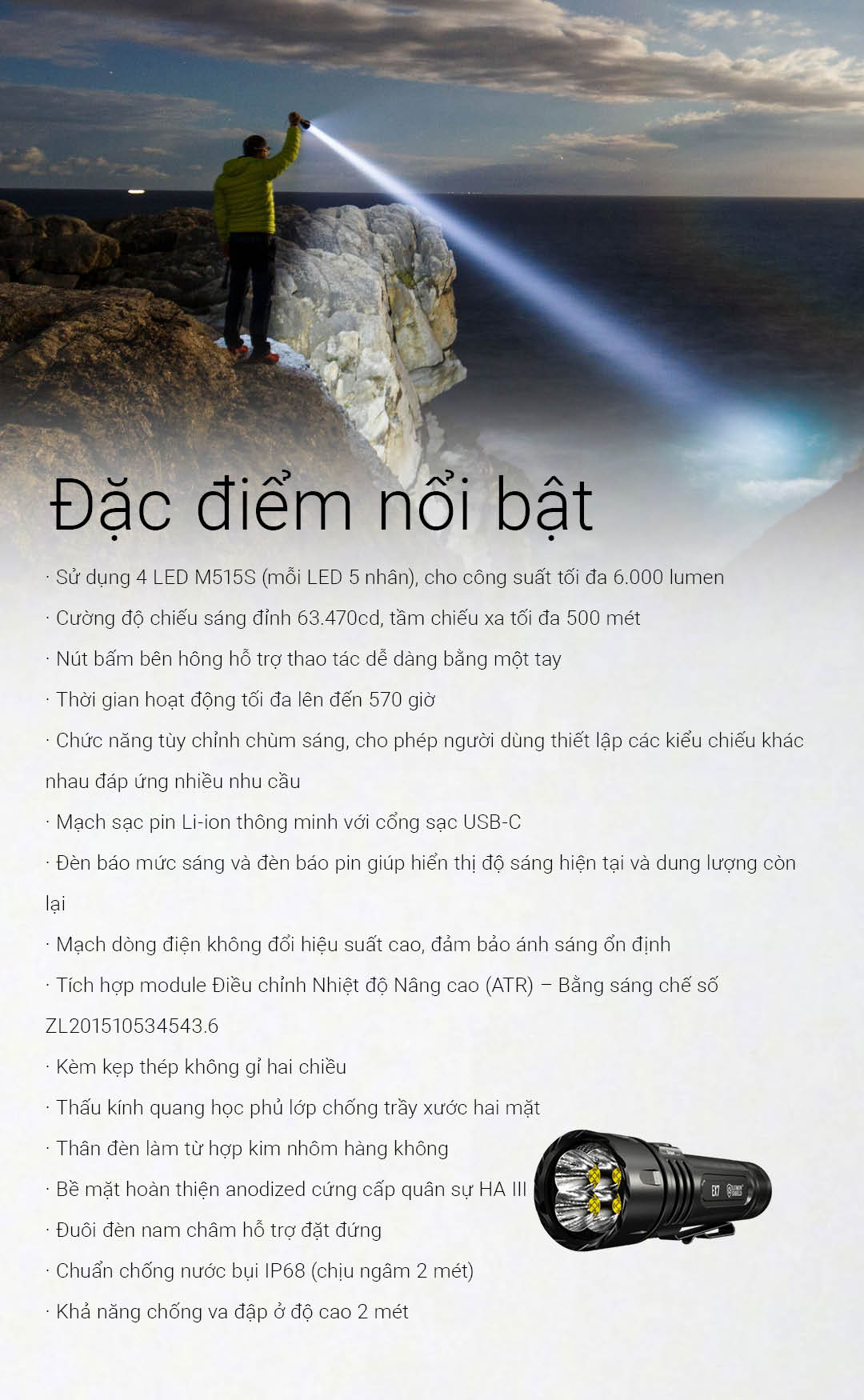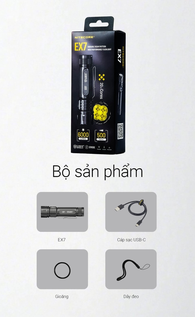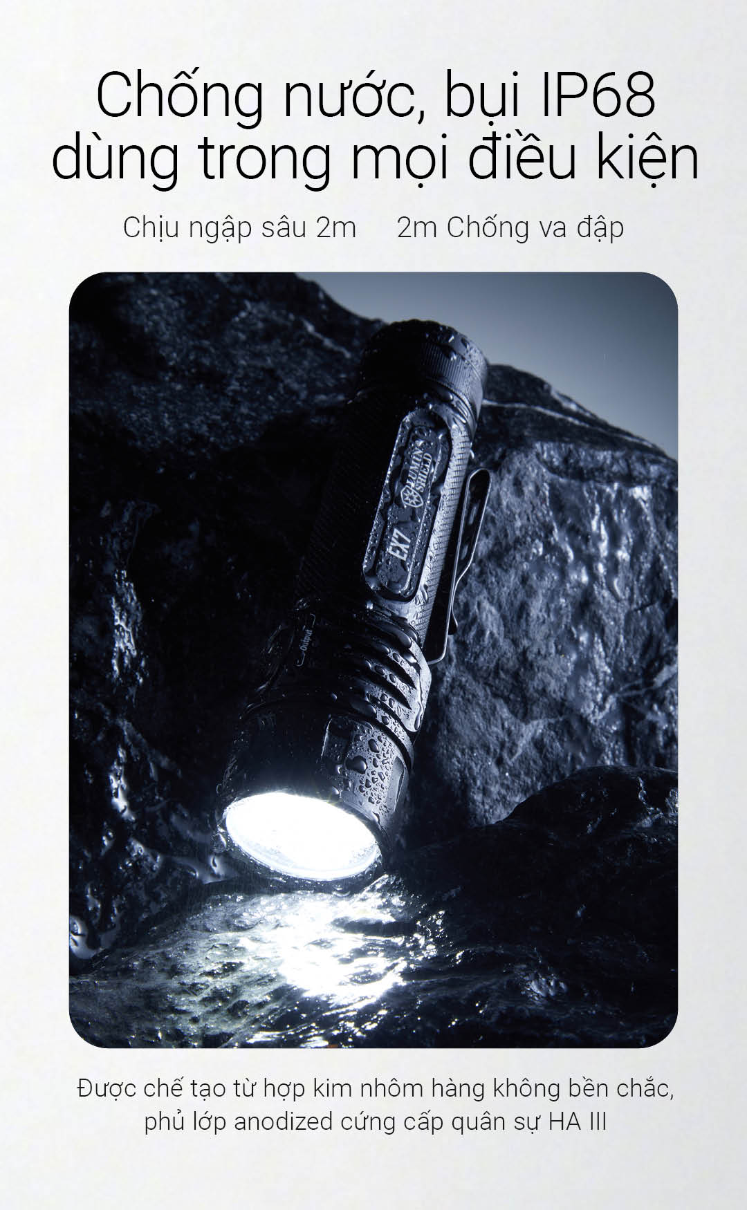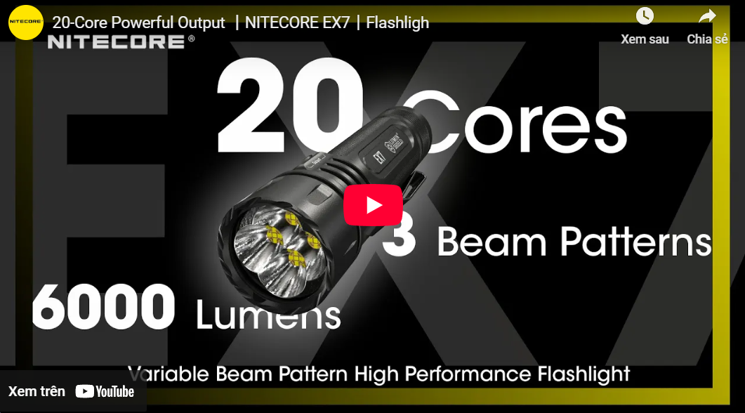 NITECORE EX7 là mẫu đèn pin cao cấp mới ra mắt ngày 4 tháng 9 năm 2025, được trang bị LED M515S đầu tiên trên thế giới, với thiết kế module LED hình chữ X đặc biệt giúp phân bổ công suất linh hoạt, tản nhiệt hiệu quả và điều khiển beam thật mượt. Với 20 lõi ánh sáng, EX7 đạt được độ sáng tối đa 6.000 lumen, tầm chiếu 500 mét, cùng nhiều chế độ chiếu: Chiếu xa, chiếu toả, chiếu cả xa và toả, cho phép tùy chỉnh mức sáng từ LOW, MID, HIGH đến TURBO. Hiệu suất ổn định và lâu dài mang lại trải nghiệm chiếu sáng đẳng cấp mới.