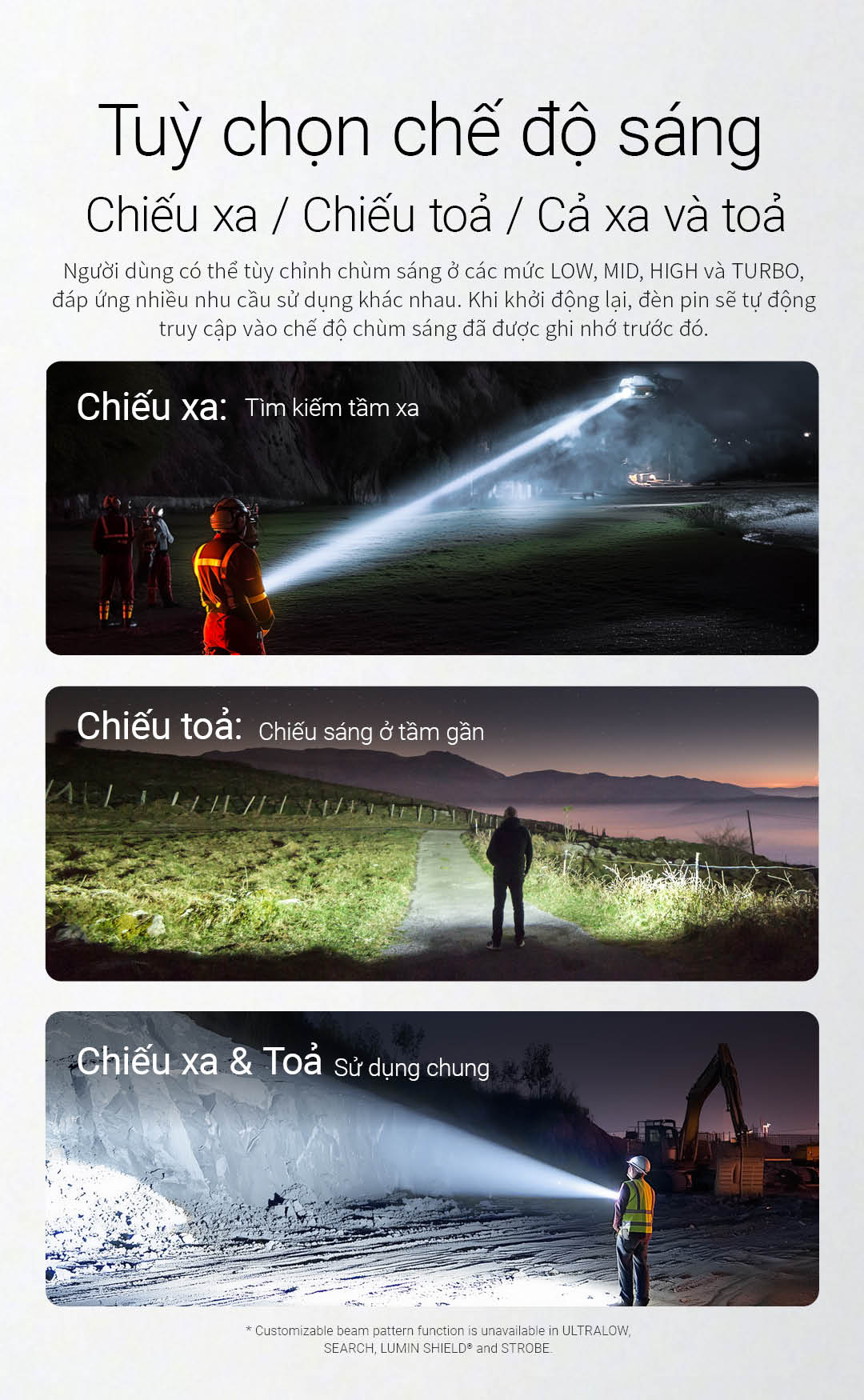 - Tùy biến 3 kiểu chùm: Chiếu xa / Chiếu toả / Cả xa & toả