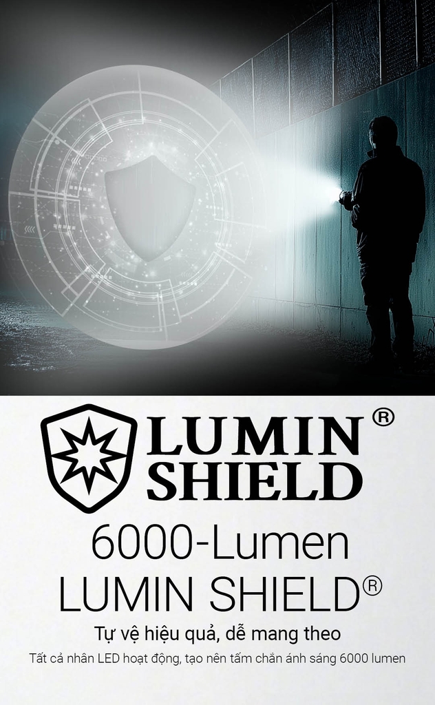 - Trong LUMIN SHIELD (lá chắn ánh sáng 6000 lm), nhấn giữ công tắc để chuyển giữa SEARCH và LUMIN SHIELD, nhả để chọn & lưu.