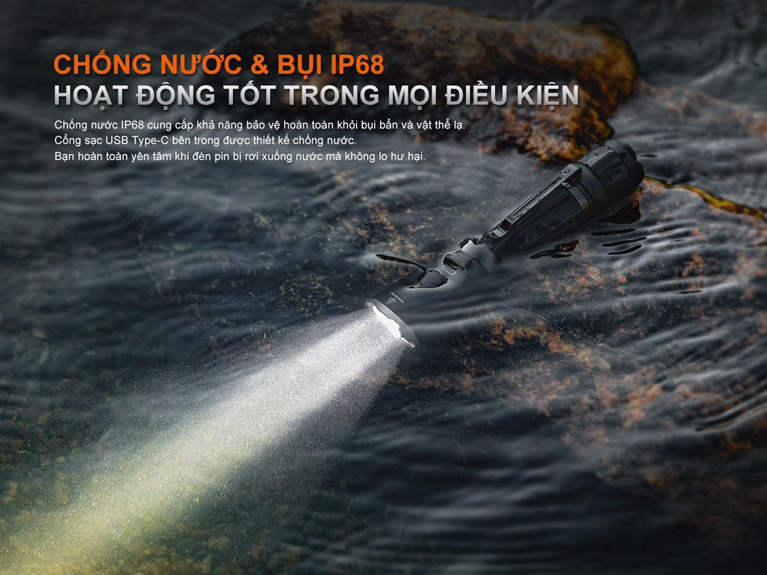 Thiết kế chắc chắn: thân hợp kim nhôm A6061-T6, viền đầu phá kính, chống va đập 1 m, IP68 (chịu nước, bụi)
