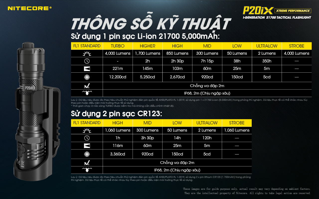 NITECORE P20iX sử dụng pin chuyên biệt Li-ion 21700i có dung lượng 5000 mAh và được sạc thuận tiện qua cổng USB Type-C ở đầu đèn. Với tất cả những tính năng trên, NITECORE P20iX sẽ trở thành công cụ đồng hành hiệu quả khi sử dụng trong các hoạt động chuyên dụng như tuầ-n tr-a, t-ác ch-iến,....