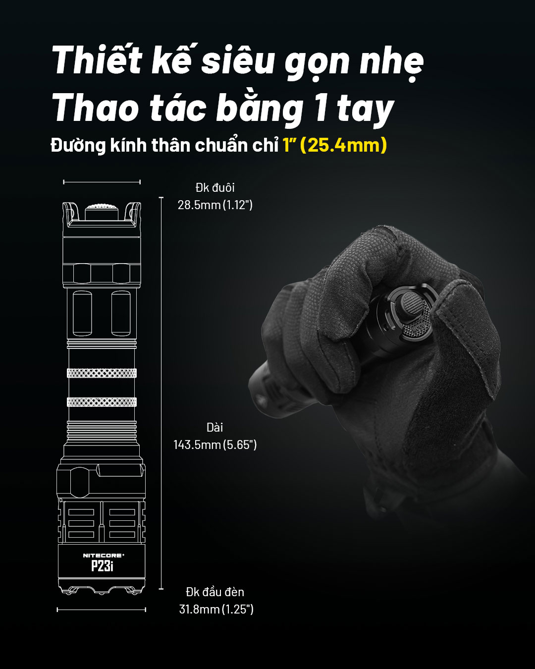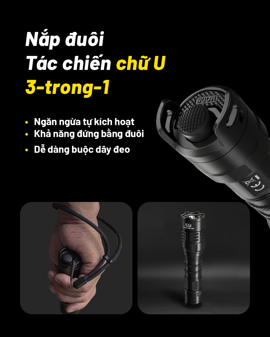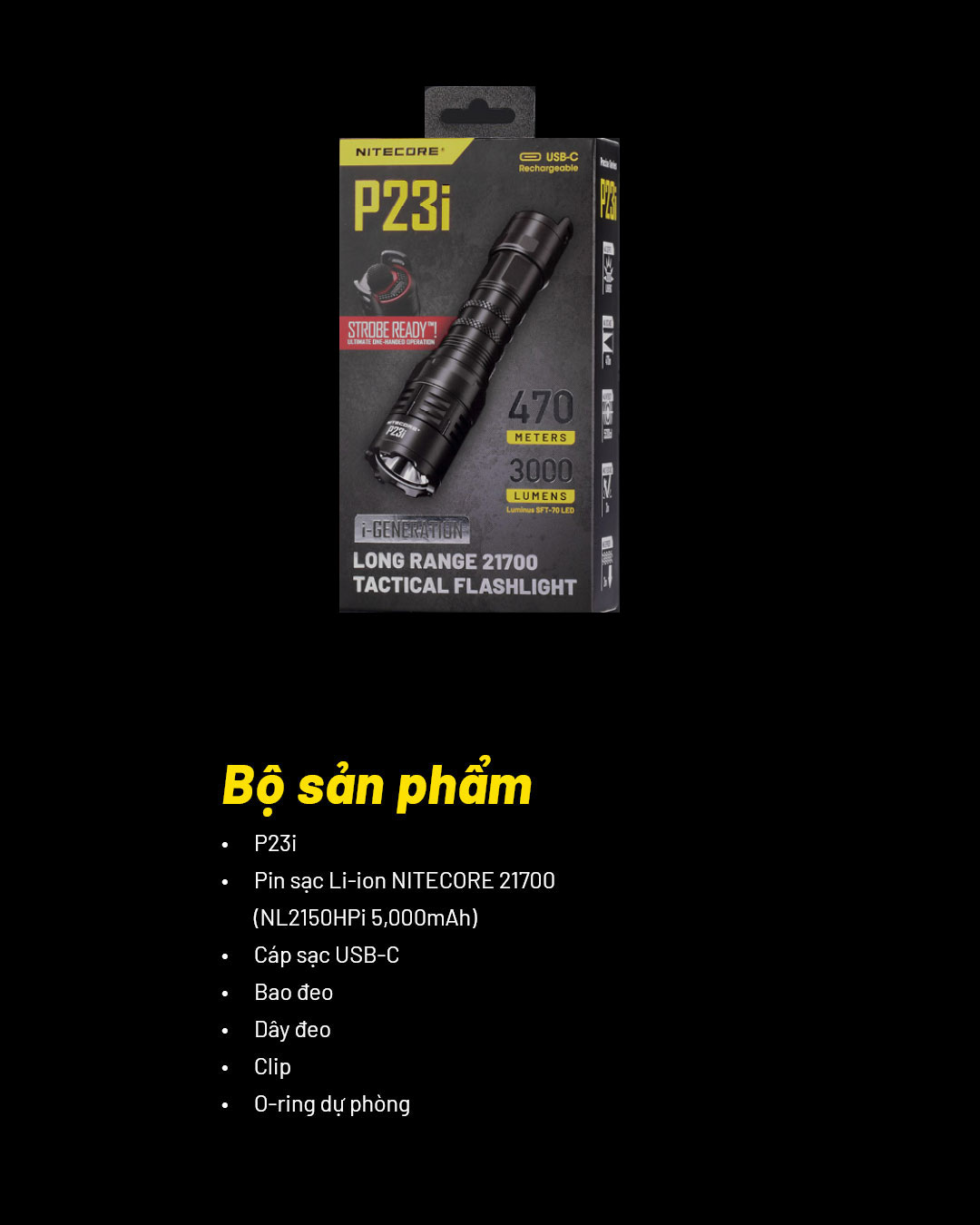 NITECORE P23i là mẫu đèn pin tá-c chi-ế-n sử dụng 1 LED Luminus SFT-70 có độ sáng 3.000 lumen, tầm chiếu xa 470m. Đèn sử dụng bộ công tắc đuôi phản ứng nhanh mới nhất từ NITECORE với công tắc chính để BẬT/TẮT, công tắc phụ để bật Strobe tức thì và đổi các chế độ. NITECORE P23i được làm từ hợp kim nhôm hàng không, được hoàn thiện ANODIZED HAIII, đạt tiêu chuẩn chống bụi, nước IP68. NITECORE P23i sử dụng pin sạc Li-ion 21700i có dung lượng 5000 mAh và được sạc thuận tiện qua cổng USB Type-C ở đầu đèn. Với tất cả những tính năng trên, NITECORE P23i sẽ trở thành công cụ đồng hành hiệu quả khi sử dụng trong thực thi luật pháp, tuầ-n tr-a, t-ác ch-iến,....
