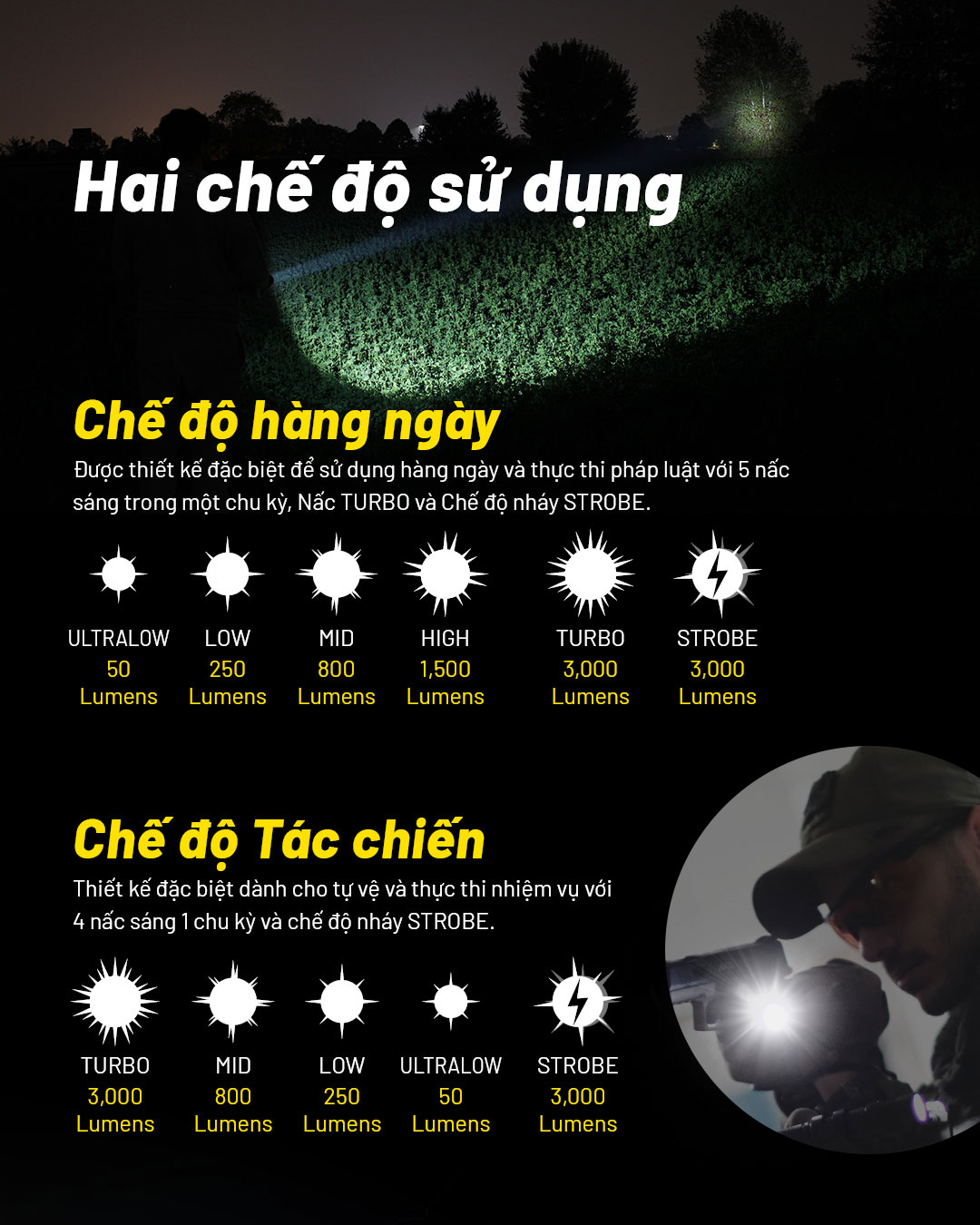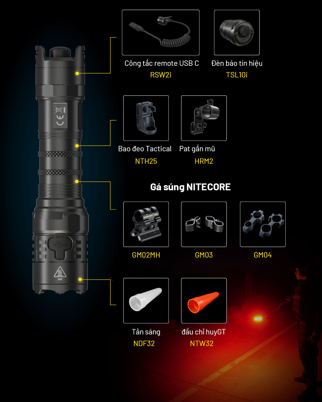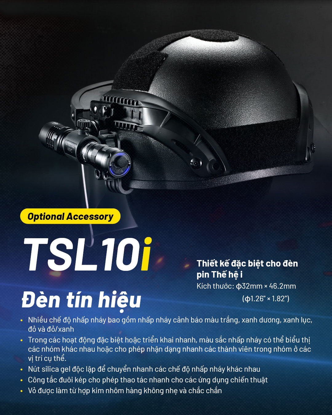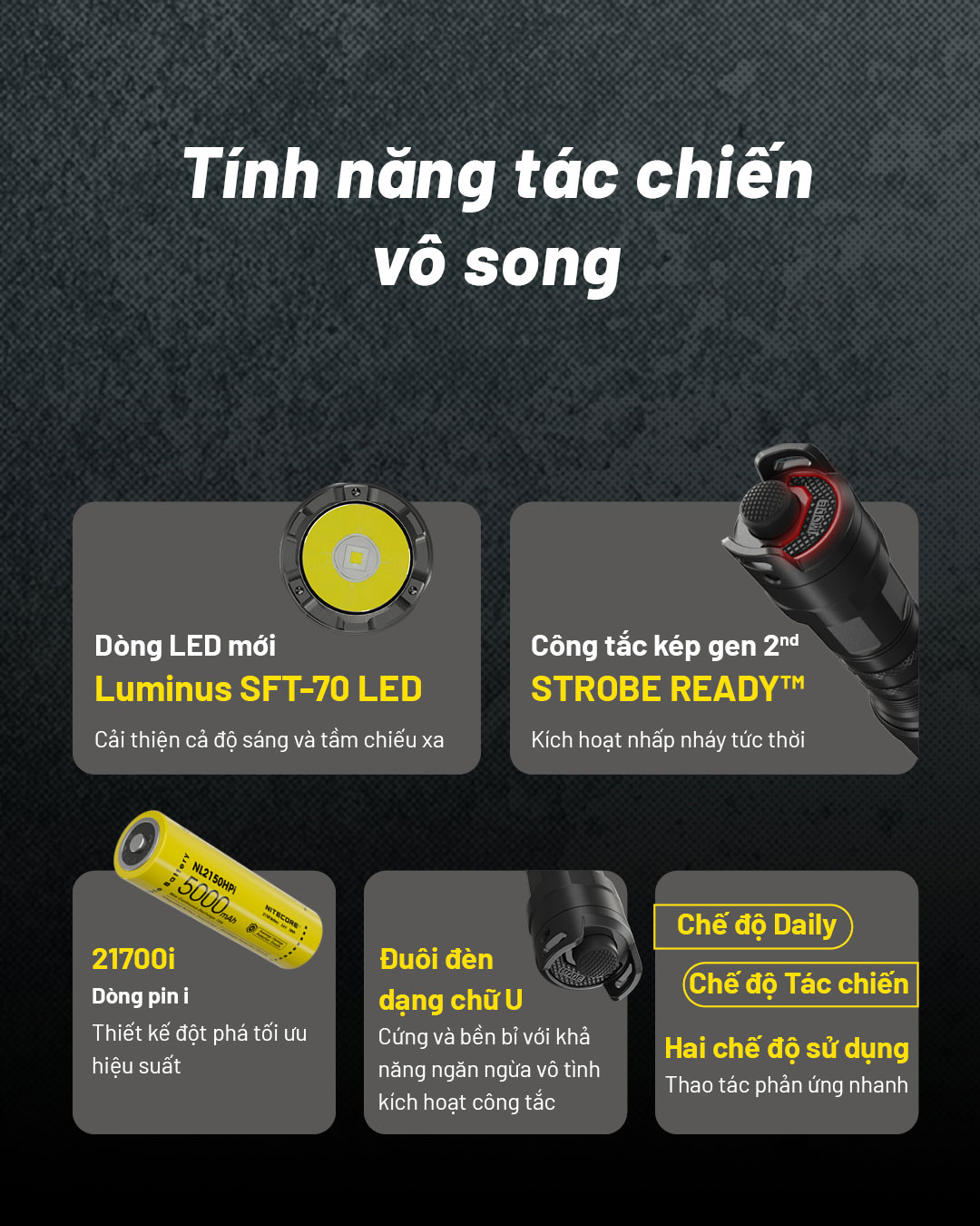 NITECORE P23i là mẫu đèn pin tá-c chi-ế-n sử dụng 1 LED Luminus SFT-70 có độ sáng 3.000 lumen, tầm chiếu xa 470m. Đèn sử dụng bộ công tắc đuôi phản ứng nhanh mới nhất từ NITECORE với công tắc chính để BẬT/TẮT, công tắc phụ để bật Strobe tức thì và đổi các chế độ. NITECORE P23i được làm từ hợp kim nhôm hàng không, được hoàn thiện ANODIZED HAIII, đạt tiêu chuẩn chống bụi, nước IP68. NITECORE P23i sử dụng pin sạc Li-ion 21700i có dung lượng 5000 mAh và được sạc thuận tiện qua cổng USB Type-C ở đầu đèn. Với tất cả những tính năng trên, NITECORE P23i sẽ trở thành công cụ đồng hành hiệu quả khi sử dụng trong thực thi luật pháp, tuầ-n tr-a, t-ác ch-iến,....