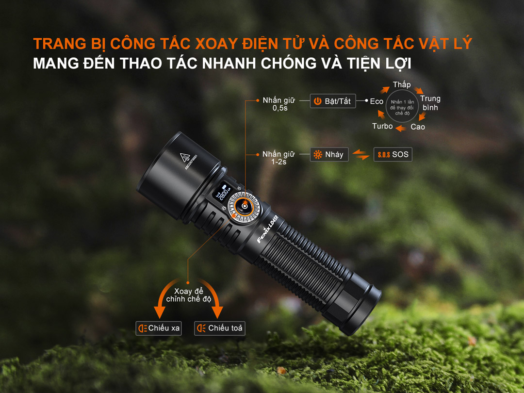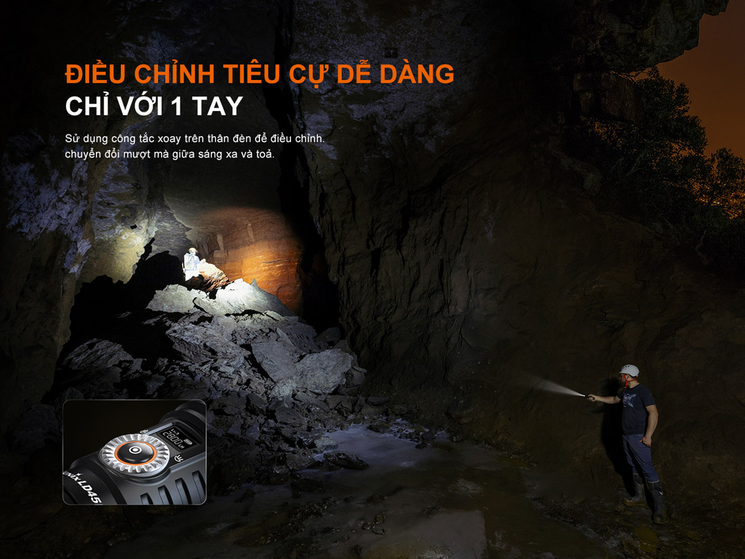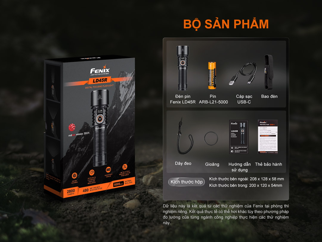 Đèn pin FENIX LD45R là mẫu đèn được ra mắt vào cuối năm 2024, với tính năng chỉnh zoom điện tử hiện đại, điều chỉnh tiêu cự chùm sáng chỉ bằng 1 tay, và màn hình OLED hiển thị thông số đèn. Đèn có độ sáng 2800 lumens, chiếu xa 480m, sử dụng 1 pin 21700 dung lượng 5000mAh(đi kèm) cho thời gian sử dụng lên tới 65 giờ, điều chỉnh tiêu cự ánh sáng nhờ vào công tắc xoay 270° cho phép người dùng dễ dàng chuyển đổi giữa sáng tỏa và sáng xa, trên đèn thiết kế 1 màn hình OLED hiển thị thông số và dung lượng pin còn lại của đèn, phù hợp cho các hoạt động ngoài trời, thám hiểm hang động, tìm kiếm,vv . Với rất nhiều tính năng ưu việt cùng ngoại hình bắt mắt, đèn đã dành được giải thiết kế RED DOT 2024