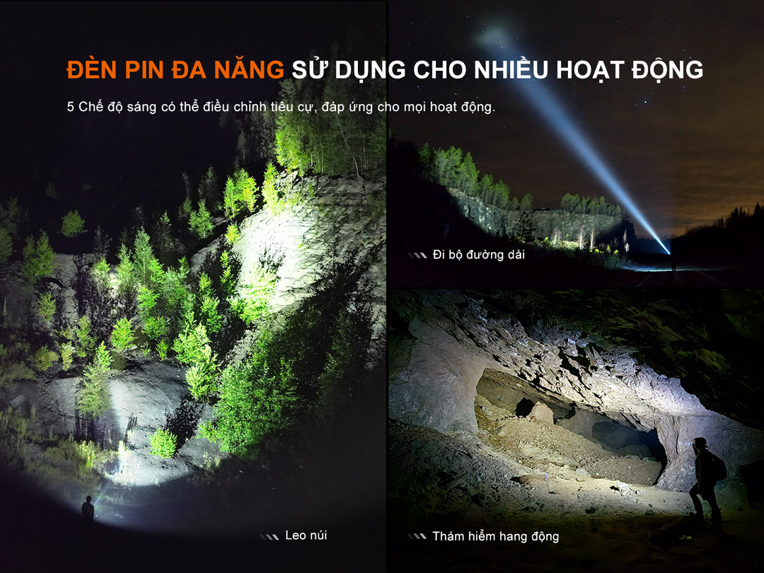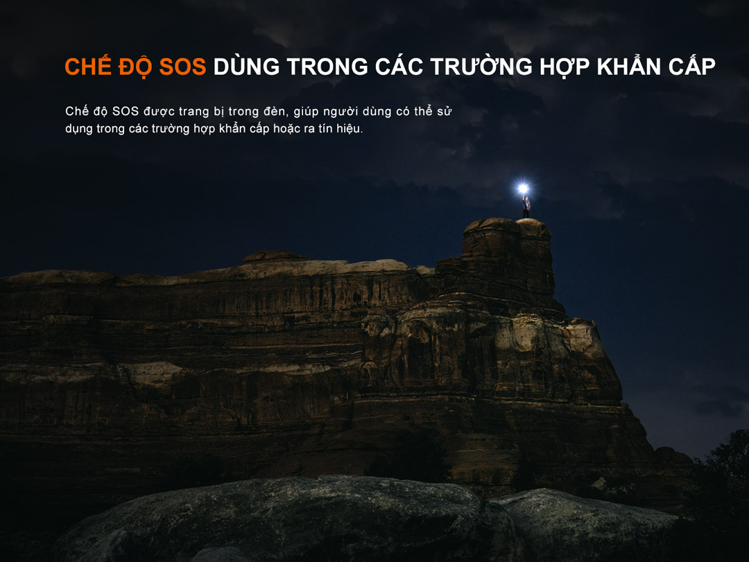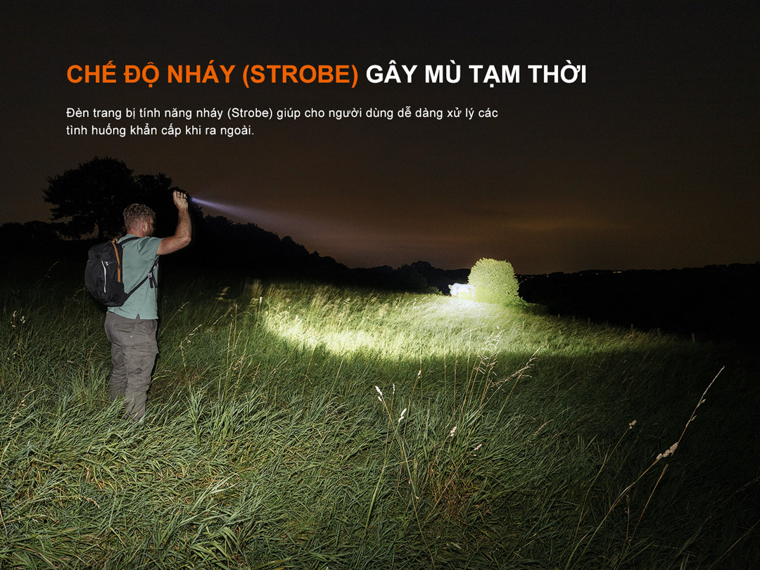 Chế độ nhấp nháy: Nhấn và giữ công tắc 1,2 giây để vào chế độ Strobe. Nhấn vào công tắc để chuyển qua Strobe → SOS.