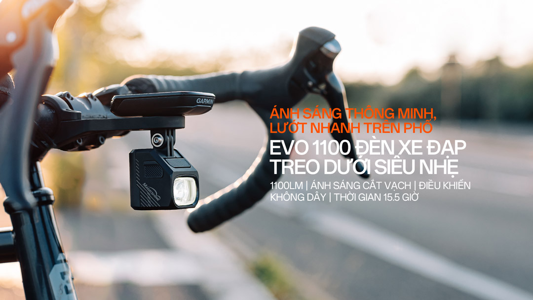 MAGICSHINE EVO1100 là đèn xe đạp thể thao cao cấp với độ sáng 1100 lumens, trang bị thấu kính chuyên dụng với đường cắt chống chói. Đèn dùng pin liền thân 1800mAh, thời gian sử dụng lên tới 15 giờ 30 phút ở mức sáng thấp. EVO1100 có thể điều khiển qua nút bấm, remote, hoặc ứng dụng điện thoại, phù hợp cho người đi xe đạp đường trường và những chuyến đi ban đêm dài.