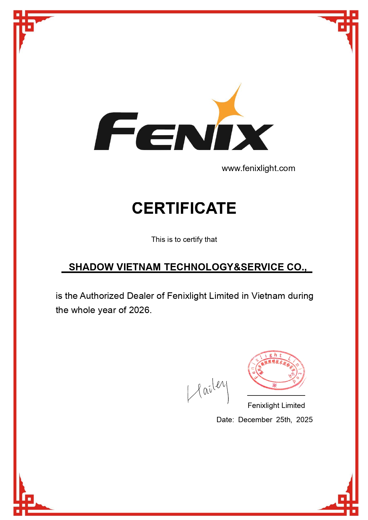 Chứng chỉ đại lý phân phối FENIX của đèn pin shadow