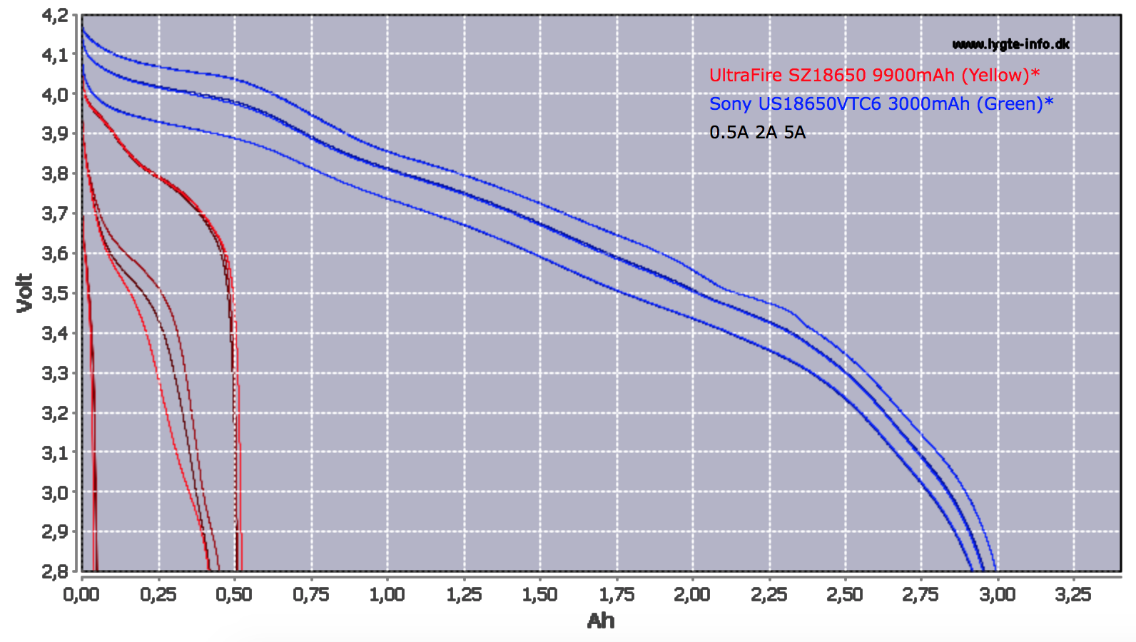 Sony VTC6 3000mAh (blue) so sánh với Ultrafire “fake” 9900mAh (red) from lygte-info.dk