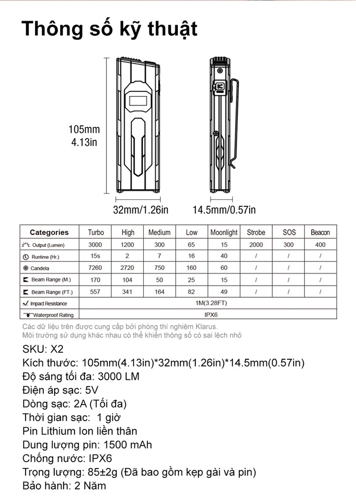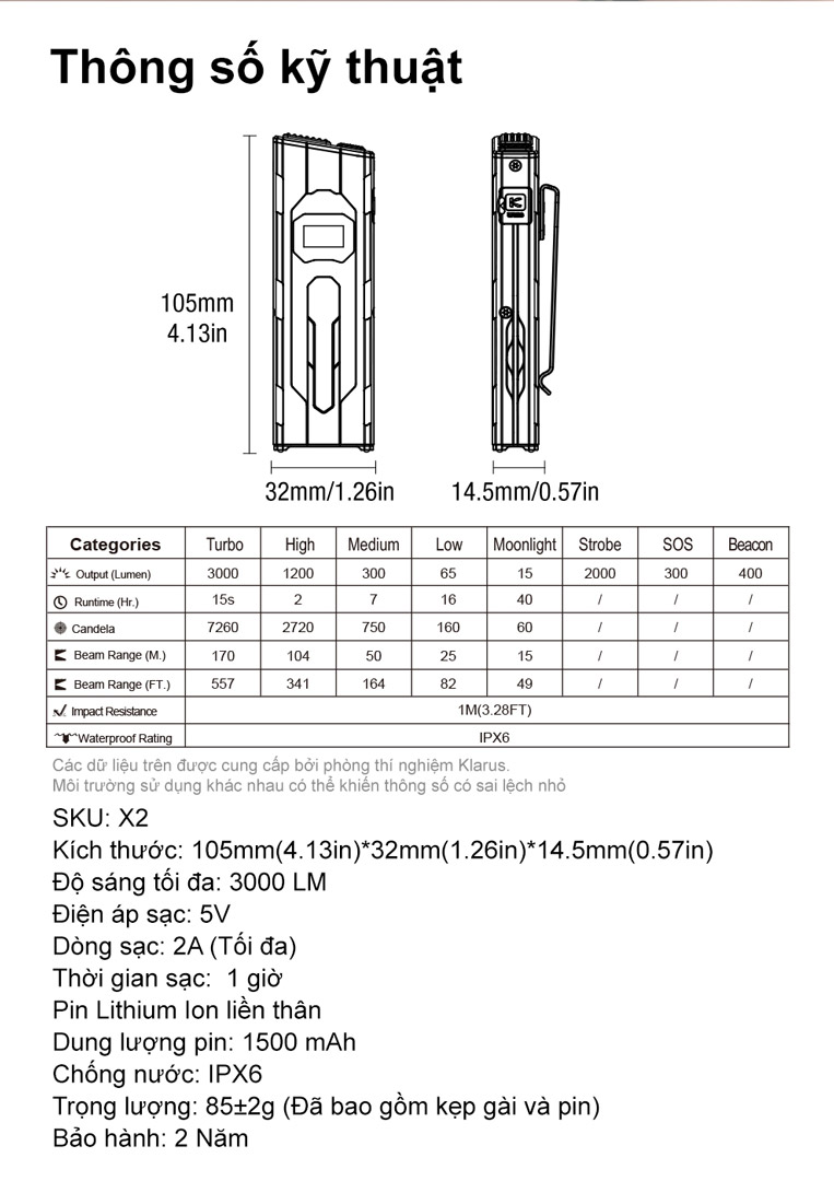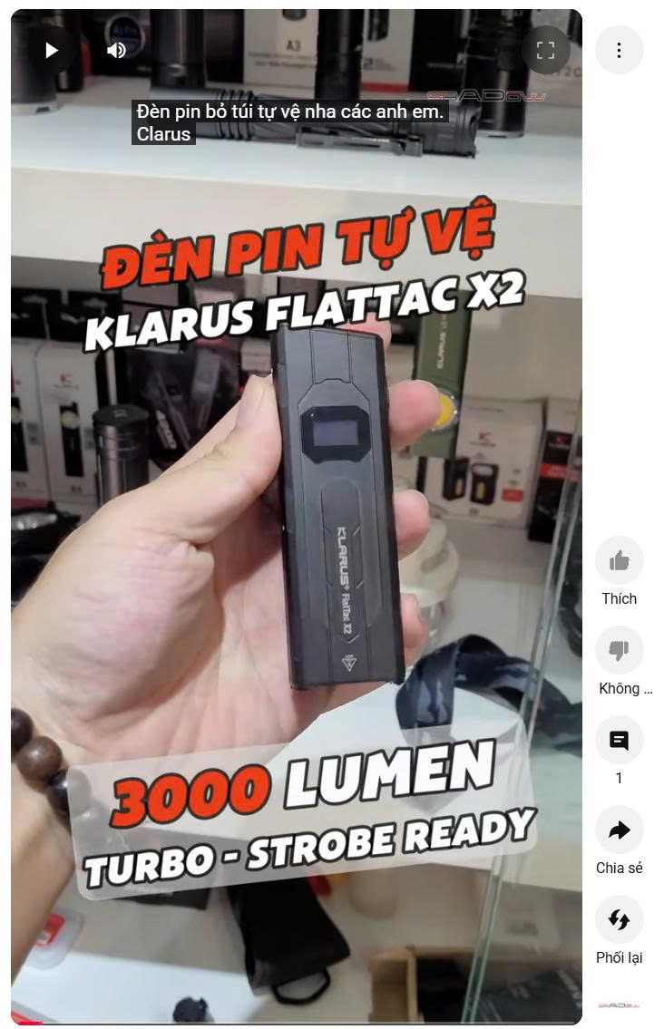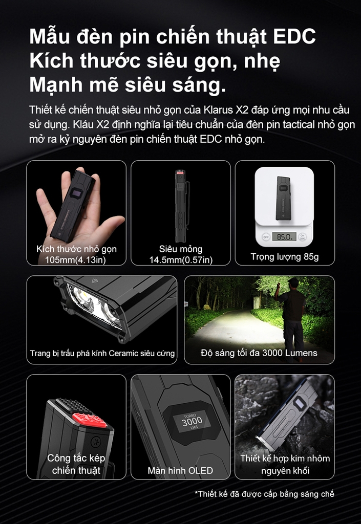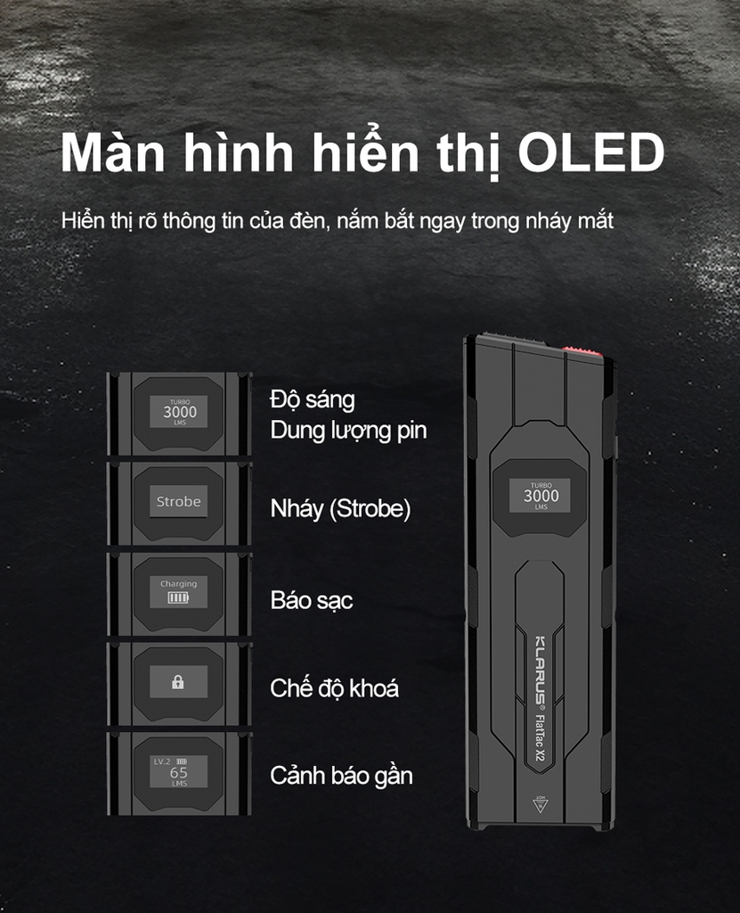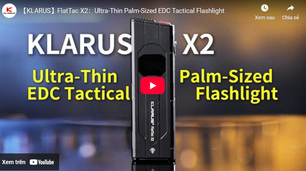 Klarus FlatTac X2 là đèn pin tactical EDC siêu mỏng – chỉ 14.5mm – nhưng cho công suất tối đa 3.000 lumen, chiếu xa 170m. Thân hợp kim nhôm nguyên khối, hạt ceramic SiAlON phá kính, màn hình OLED hiển thị mức pin/chế độ, công tắc kép thao tác cực nhanh. Pin Li-ion 1500mAh tích hợp, USB-C 2A sạc đầy khoảng 1 giờ. Bền bỉ IPX6, chịu rơi 1m, nặng khoảng 85g – gọn bỏ túi, mạnh mẽ cho tự vệ, tuần tra, EDC hằng ngày.