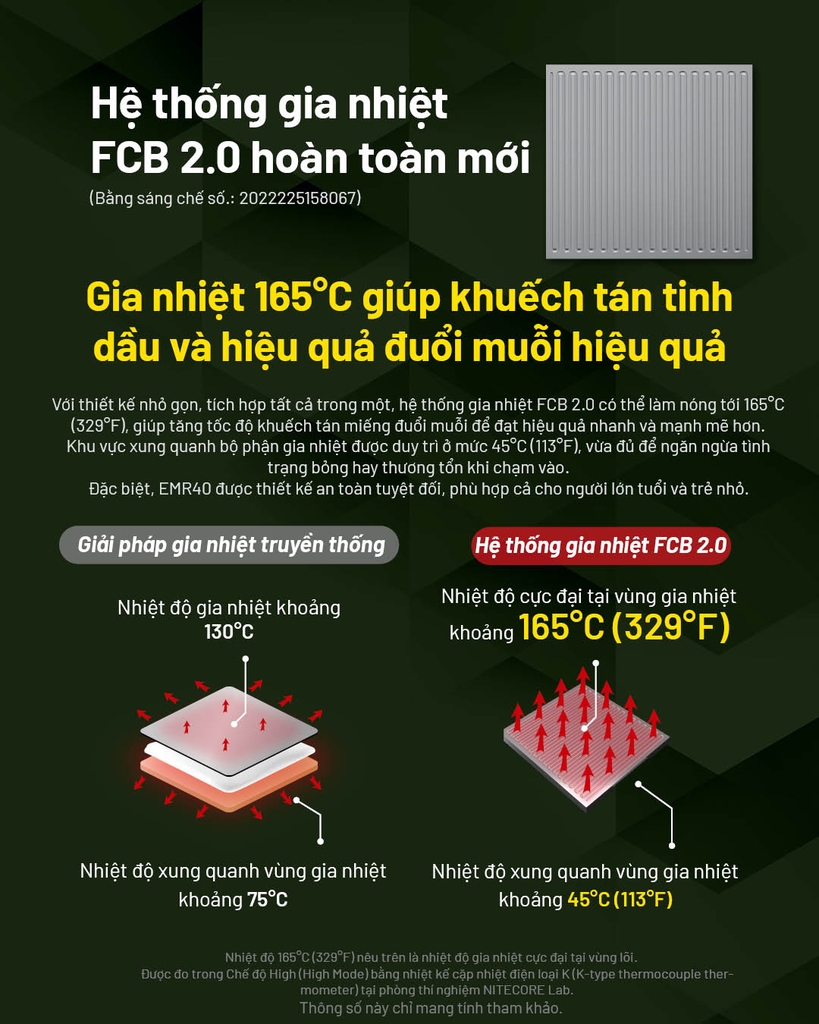 • FCB 2.0 Heating System (bằng sáng chế): gia nhiệt đều, hiệu quả đuổi muỗi tốt hơn; nhiệt độ vùng sưởi 165°C.