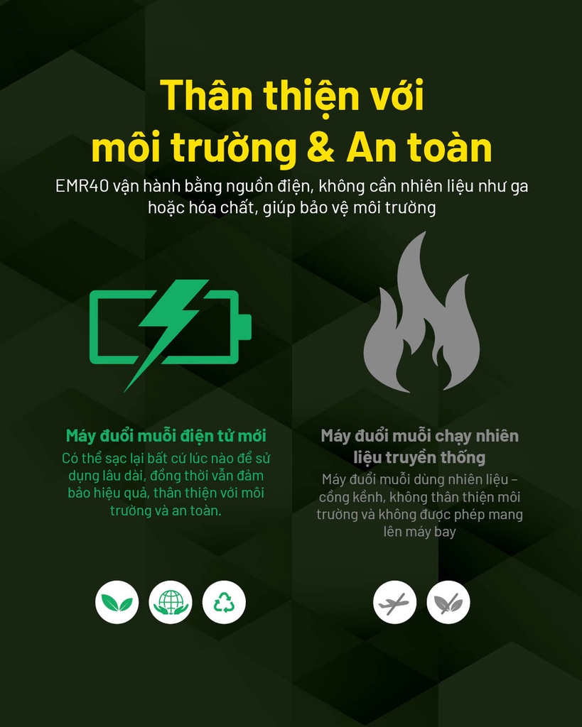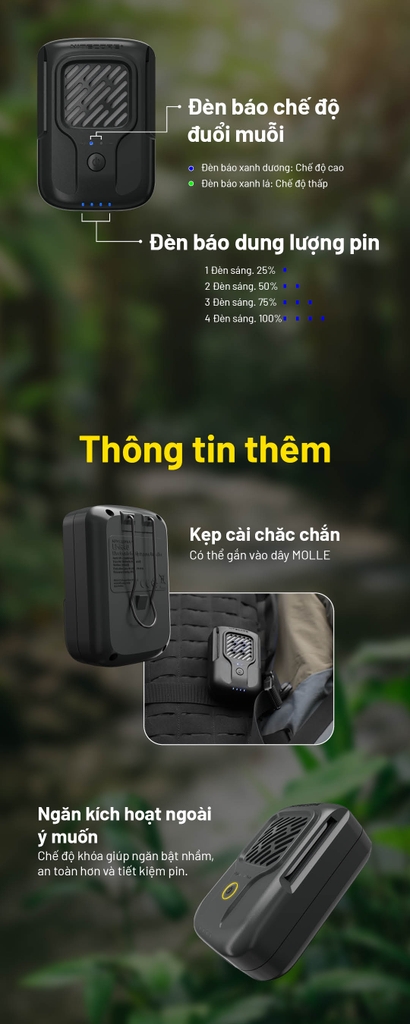 NITECORE EMR40 là máy đuổi muỗi điện tử chuyên dụng ngoài trời. Hệ sưởi FCB 2.0 đạt 165°C (329°F) giúp khuếch tán miếng đuổi muỗi nhanh và đồng đều, tạo vùng bảo vệ tới 16 ft (≈5 m) ở chế độ Cao hoặc 11 ft (≈3,5 m) ở chế độ Thấp. Pin 10.000mAh cho 10 giờ sử dụng, IPX5 chống nước, chịu rơi 1 m, nặng chỉ 229 g – lý tưởng cho trekking, camping, câu cá, dã ngoại…