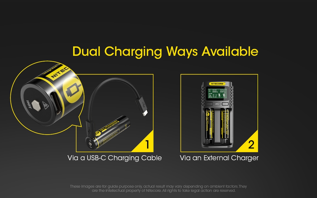 2 cách sạc: qua cáp USB-C tích hợp hoặc đặt trên bộ sạc ngoài tương thích 18650.