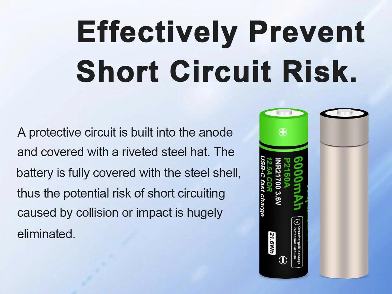 - Mũ thép tán + PCB bảo vệ đặt ở cực dương giúp giảm rủi ro chập mạch khi va đập.
