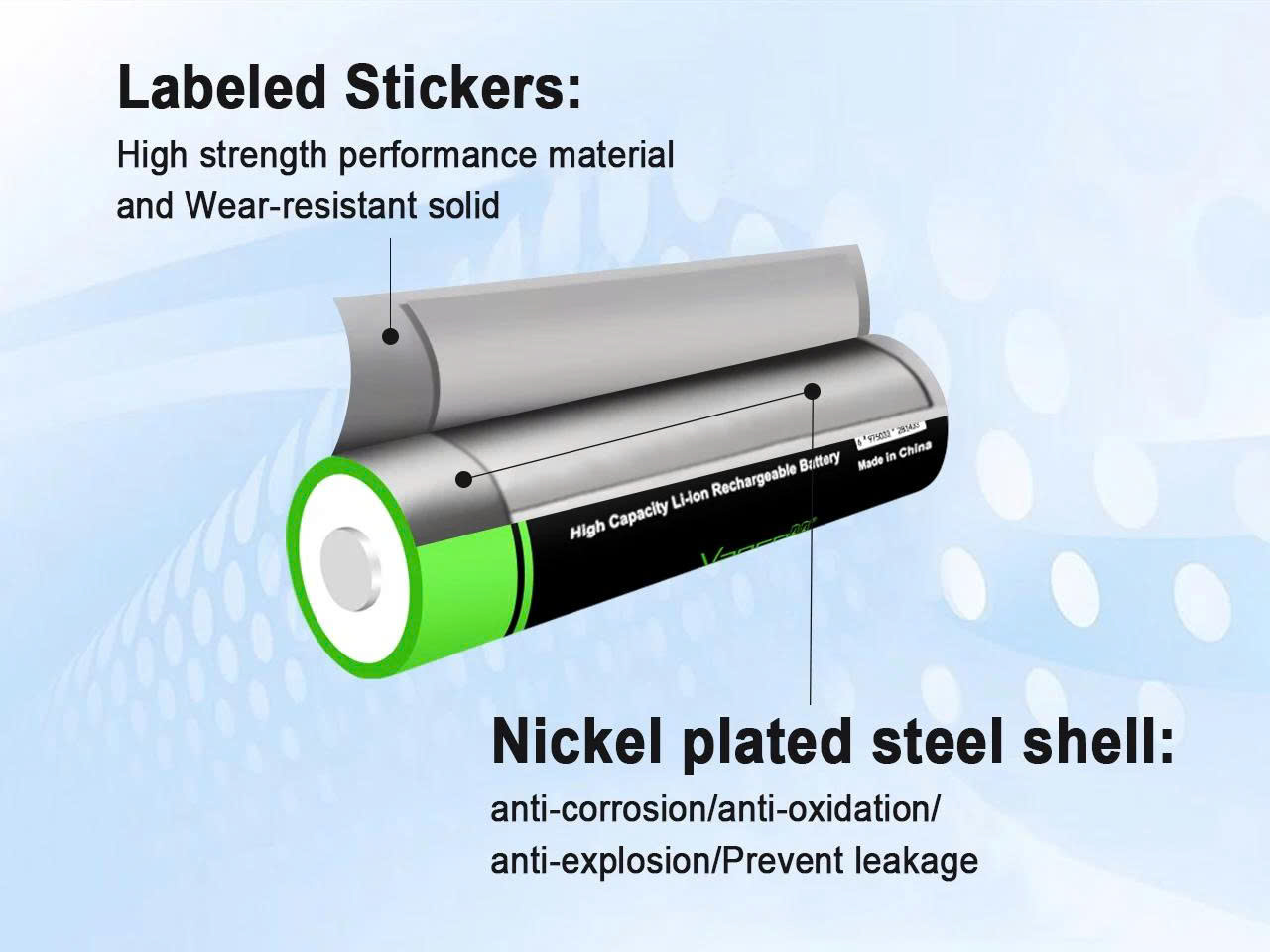 - Vỏ thép mạ niken + mũ thép tán ở cực dương: bền, giảm rủi ro chập mạch.