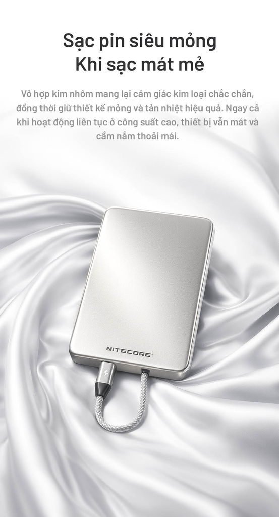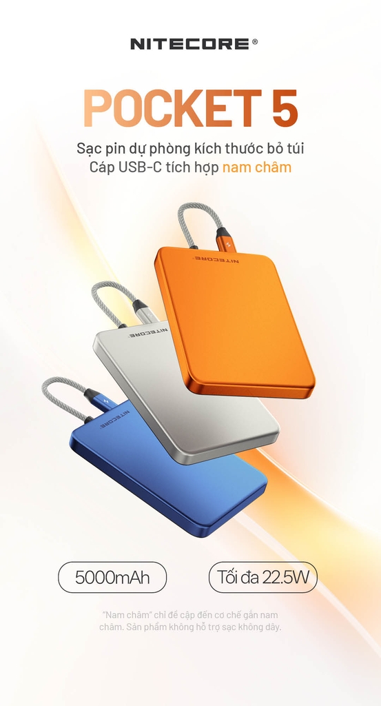 NITECORE POCKET 5 là mẫu sạc dự phòng thiết kế siêu mỏng chỉ 9mm, tích hợp cáp USB-C sẵn trong thân và hỗ trợ gắn nam châm vào điện thoại giúp sạc tiện lợi khi di chuyển. Sản phẩm mang lại sự tiện dụng của pin nam châm nhưng vẫn dùng sạc có dây nhanh và hiệu quả hơn so với sạc không dây.