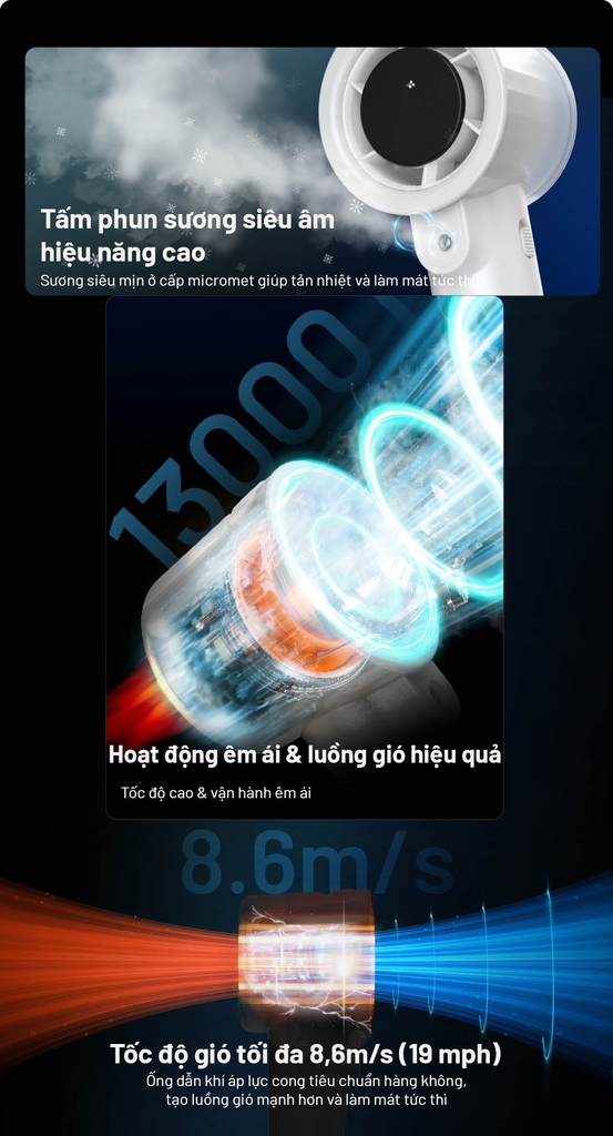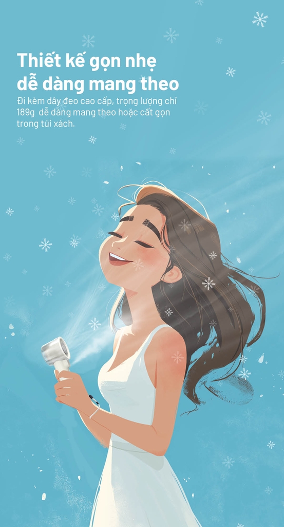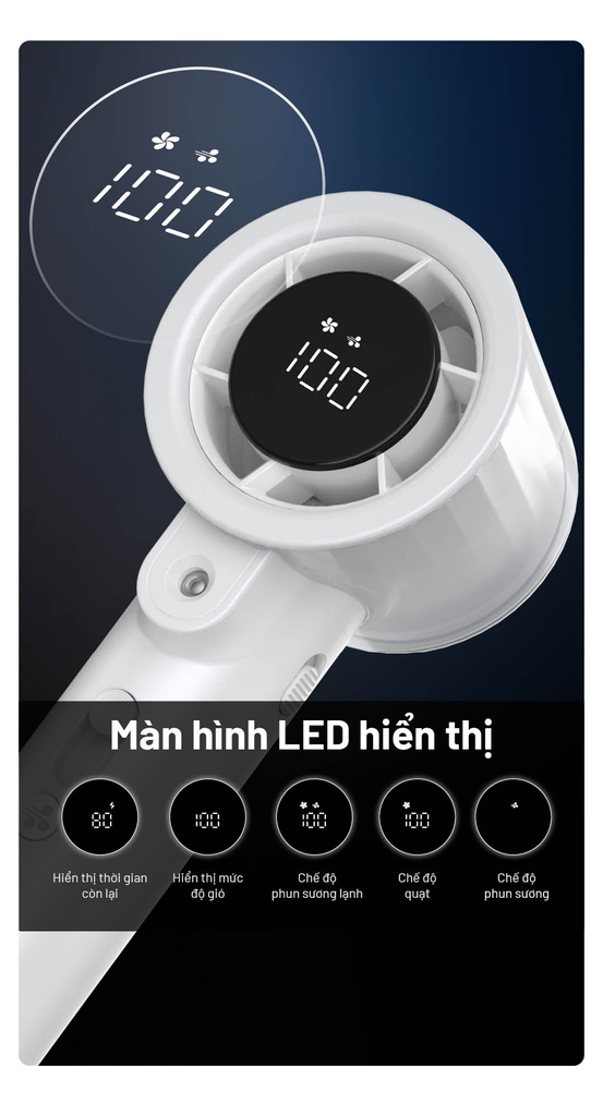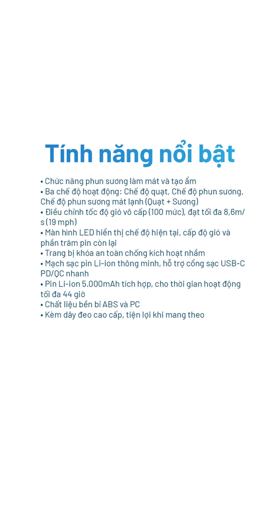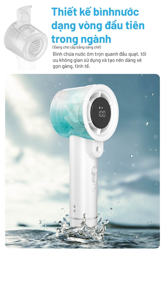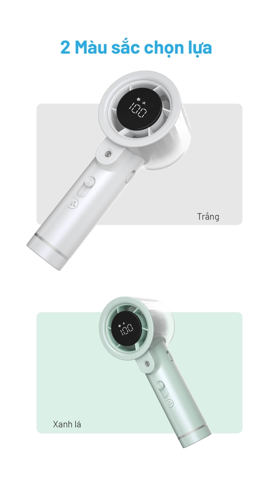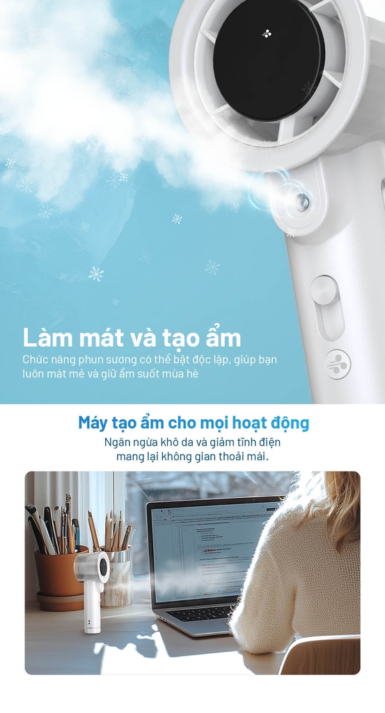 - Chế độ phun sương siêu âm – giữ ẩm da, làm mát tự nhiên.