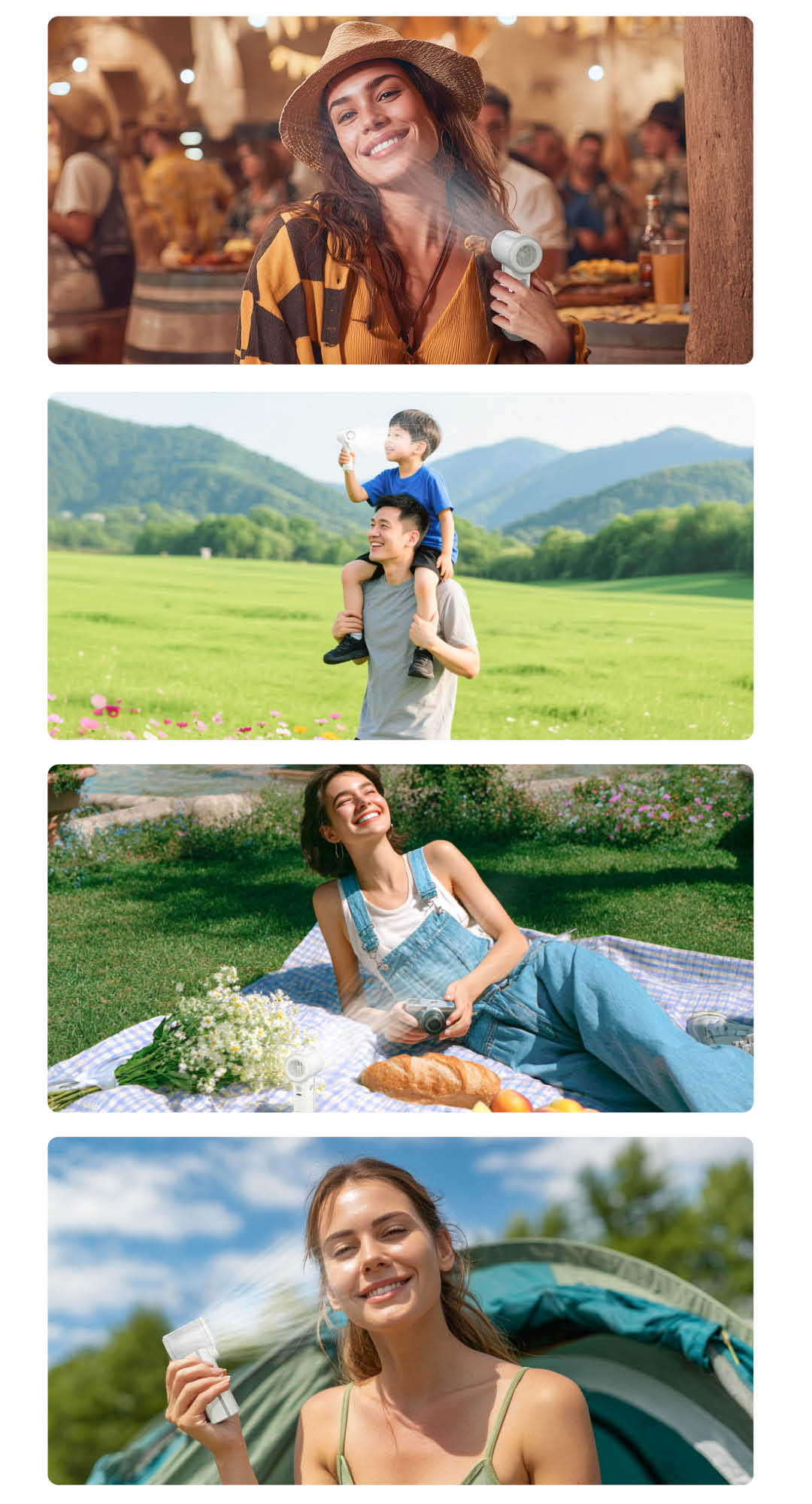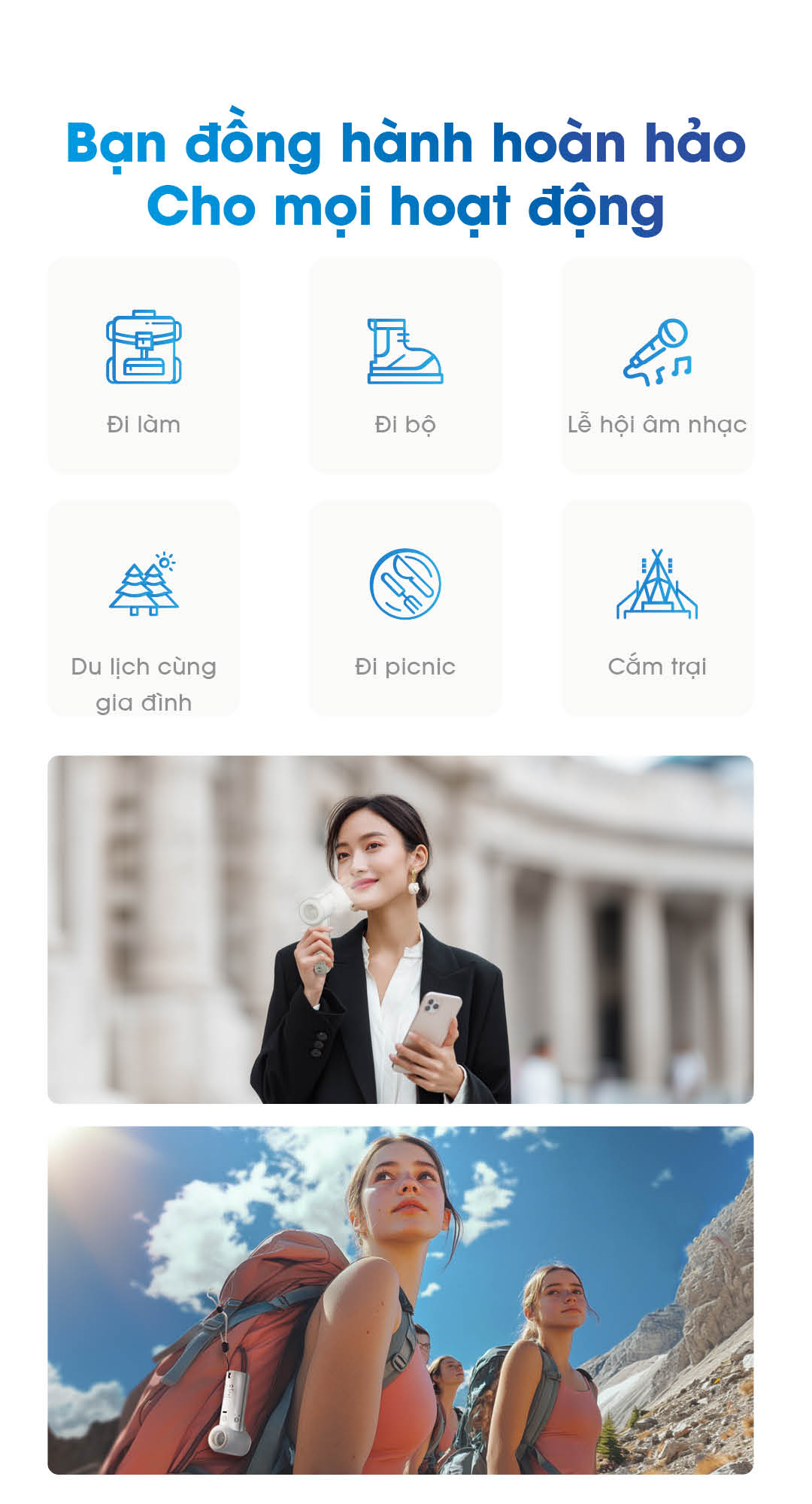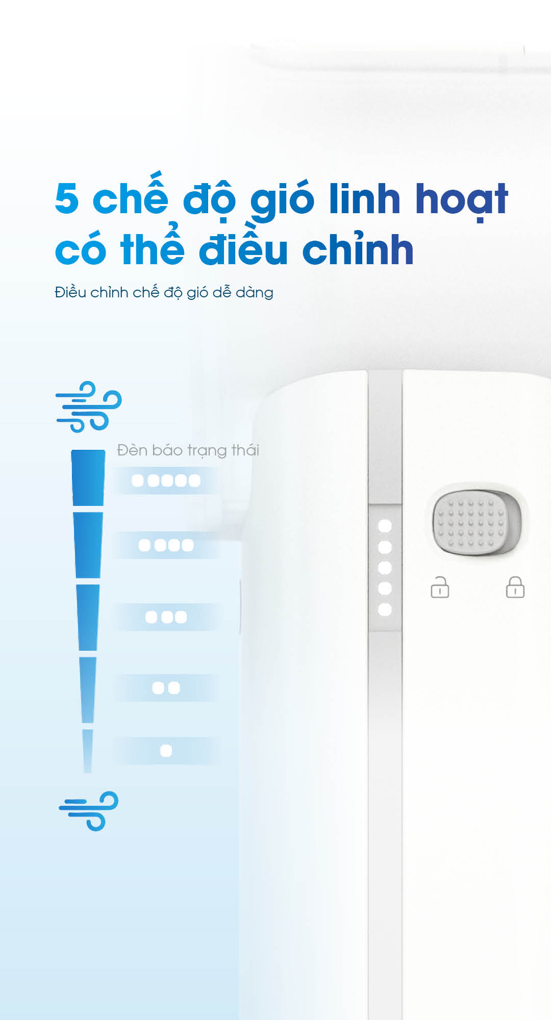 - 5 cấp gió trong chế độ quạt – tùy tình huống trong nhà/ngoài trời.