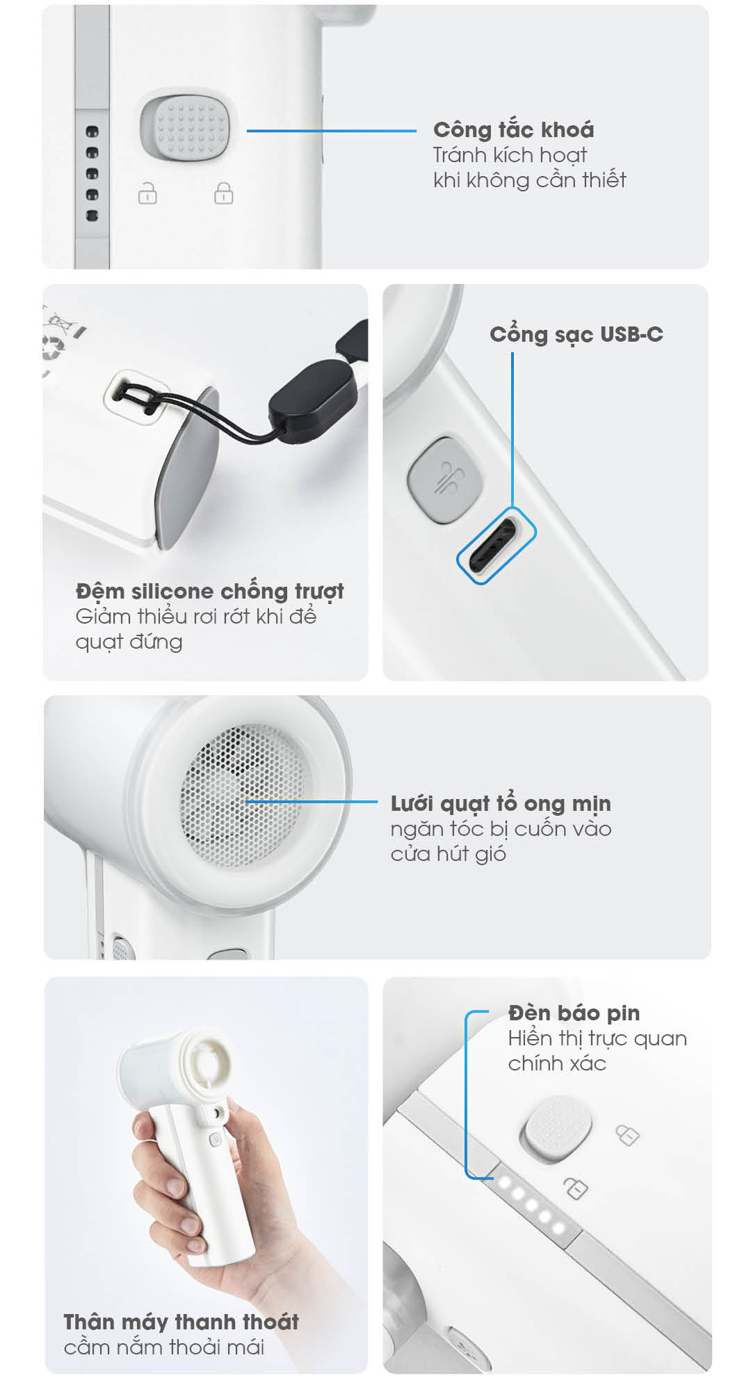 - Công tắc khóa tránh kích hoạt ngoài ý muốn; đèn báo pin trực quan; đệm silicone chống trượt; lưới quạt mịn chống cuốn tóc